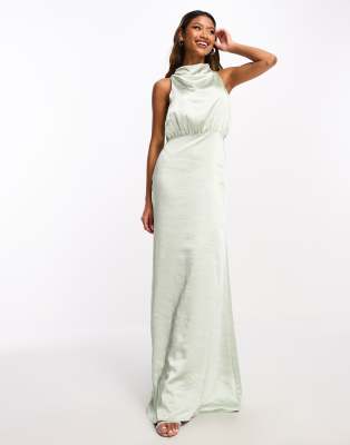 Pretty Lavish Bridesmaid Farrah high neck drape satin maxi dress in sage-Green