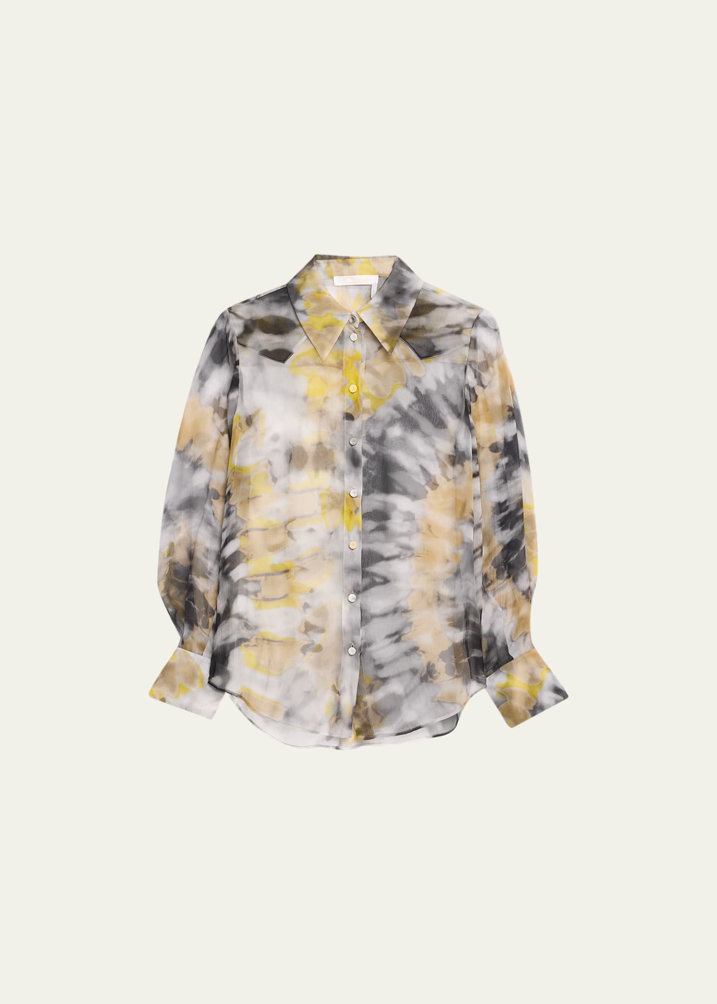 Chloe crepe de chine top with abstract print Point collar; button front Long sleeves; button cuffs Relaxed fit Back yoke Silk Ramie lining Professional cleaning recommended Made in France