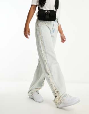 Pull & Bear wide leg jeans with distressed side detail in light bleached blue - part of a set
