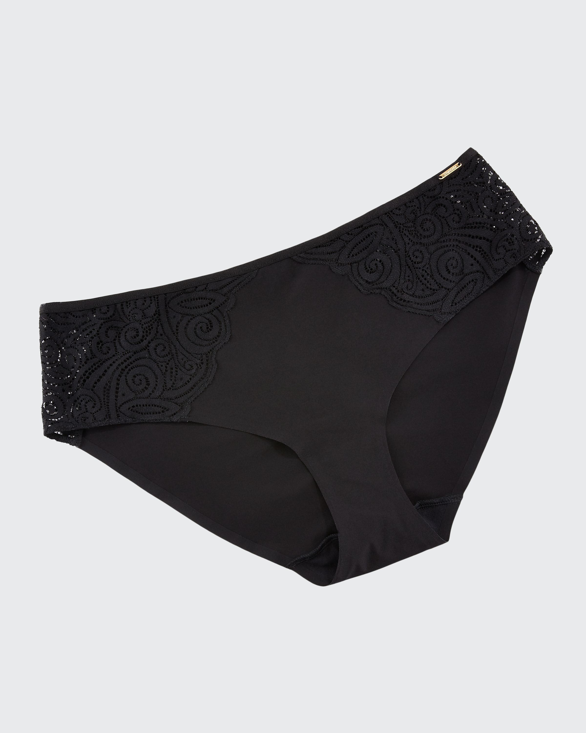 Chantelle "Pyramide" hipster briefs with lace-insets. Nontransparent fabric ensures a modest, comfortable fit while lace panels at sides add femininity. Medium-rise panty is the perfect pair to all-day comfort. Seamless, smooth waistband and leg openings ensure no visible panty lines. Mid rise elasticized waist. Scalloped leg openings. Cotton-lined gussets Cotton-lined gusset. Nylon/spandex. Imported. Designed in France.