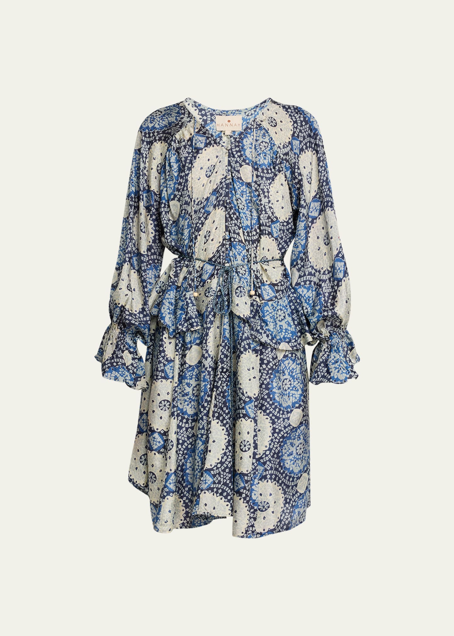 Hannah Artwear "Quinn" hand-block printed dress complete with ruffles on the waist and cuffs Approx. 37.5"L from shoulder to hem Split neckline with ties Long raglan sleeves; approx. 24.0"L Fabric-covered button front Removable yarn belt Wrap silhouette Mini length Silk Unlined Dry clean Imported