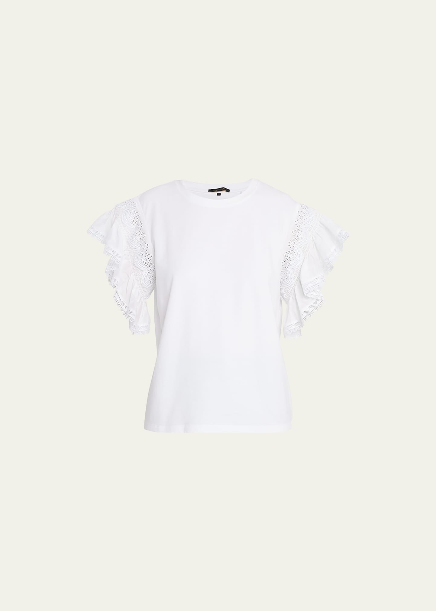 Kobi Halperin "Raveena" lace-trim blouse with eyelet details and smocked sleeves Approx. 24"L from shoulders to hem Crew neckline Short flutter sleeves Relaxed fit Pullover style Cotton/spandex Imported