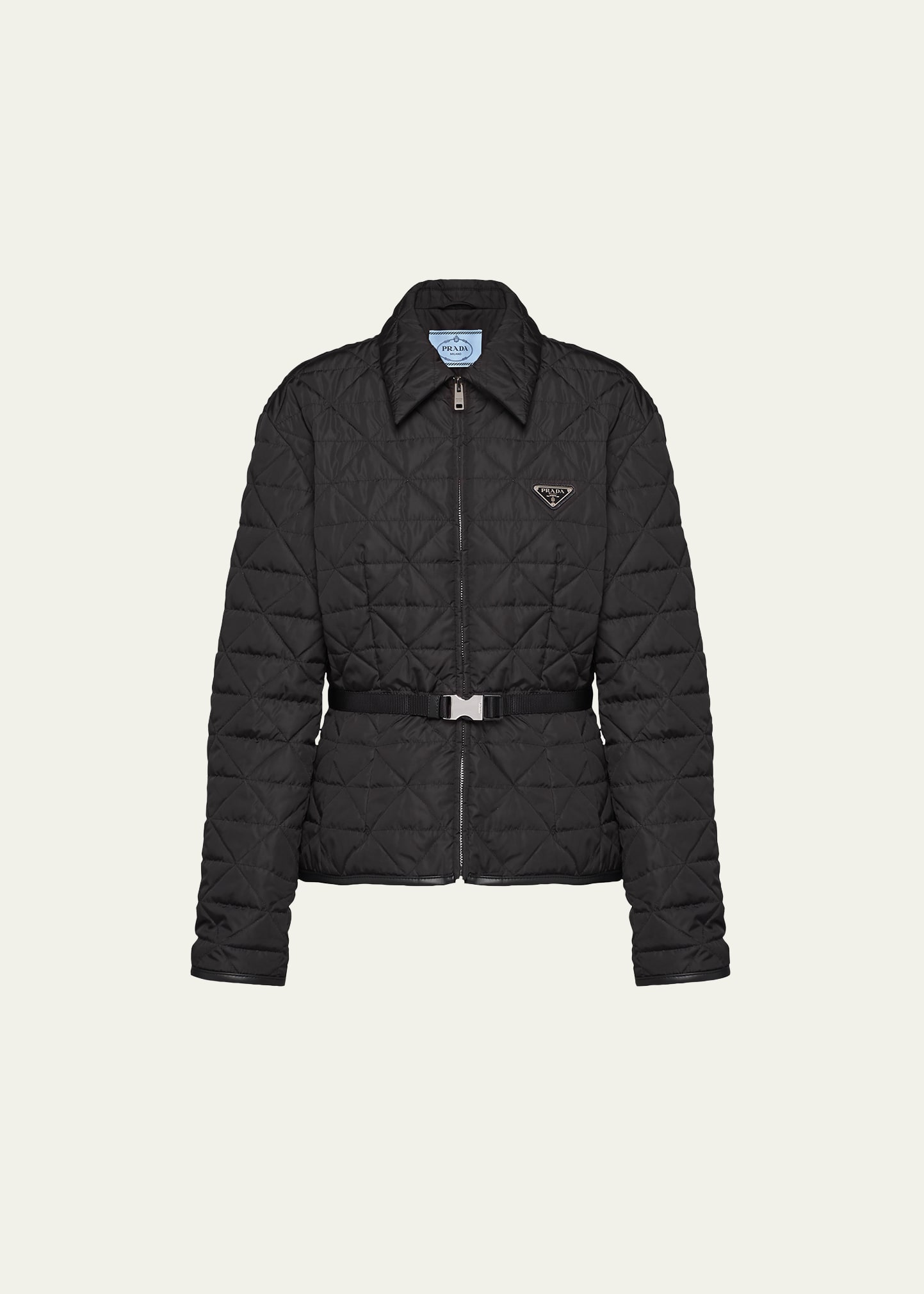 Prada quilted jacket with enameled metal triangle logo and tape belt Point collar; zip front Long sleeves Belted waist Regular fit Cropped length Recycled nylon Polyester fill Dry clean Made in Italy