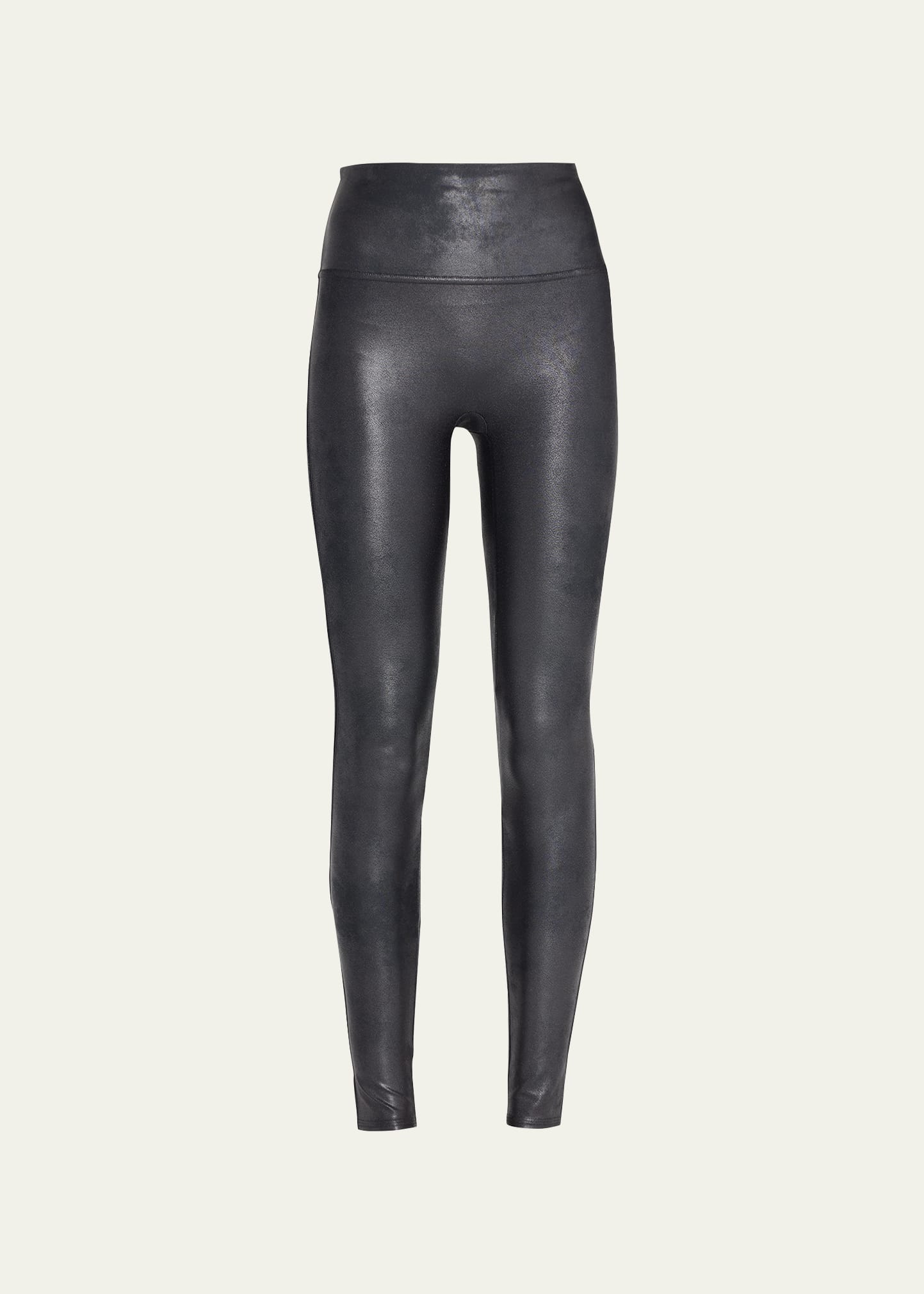 Spanx "Ready-to-Wow" leather-like coated jersey leggings. Approx. measurements: 9.5" front rise; 25" inseam; 8" leg opening. Slimming, shaping design. Wide control-banded, high-rise waist. Slim legs. Pull-on style. Nylon/spandex; polyester/spandex waist lining. Hand wash. Imported.