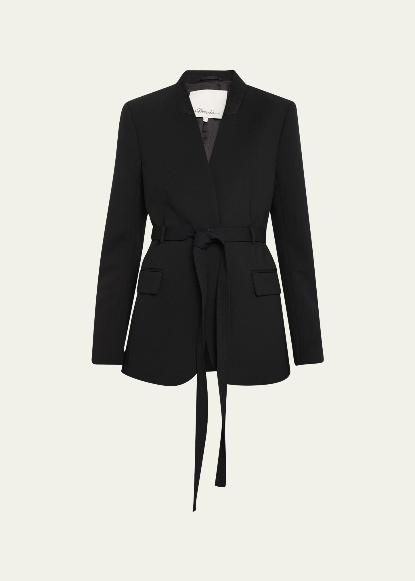 3.1 Phillip Lim wool-blend blazer featuring a self-tie waist Collarless; V neckline Singel-breasted front Long sleeves; button cuffs Hip flap pockets Relaxed fit Single button closure Virgin wool/nylon/polyamide Dry clean Imported