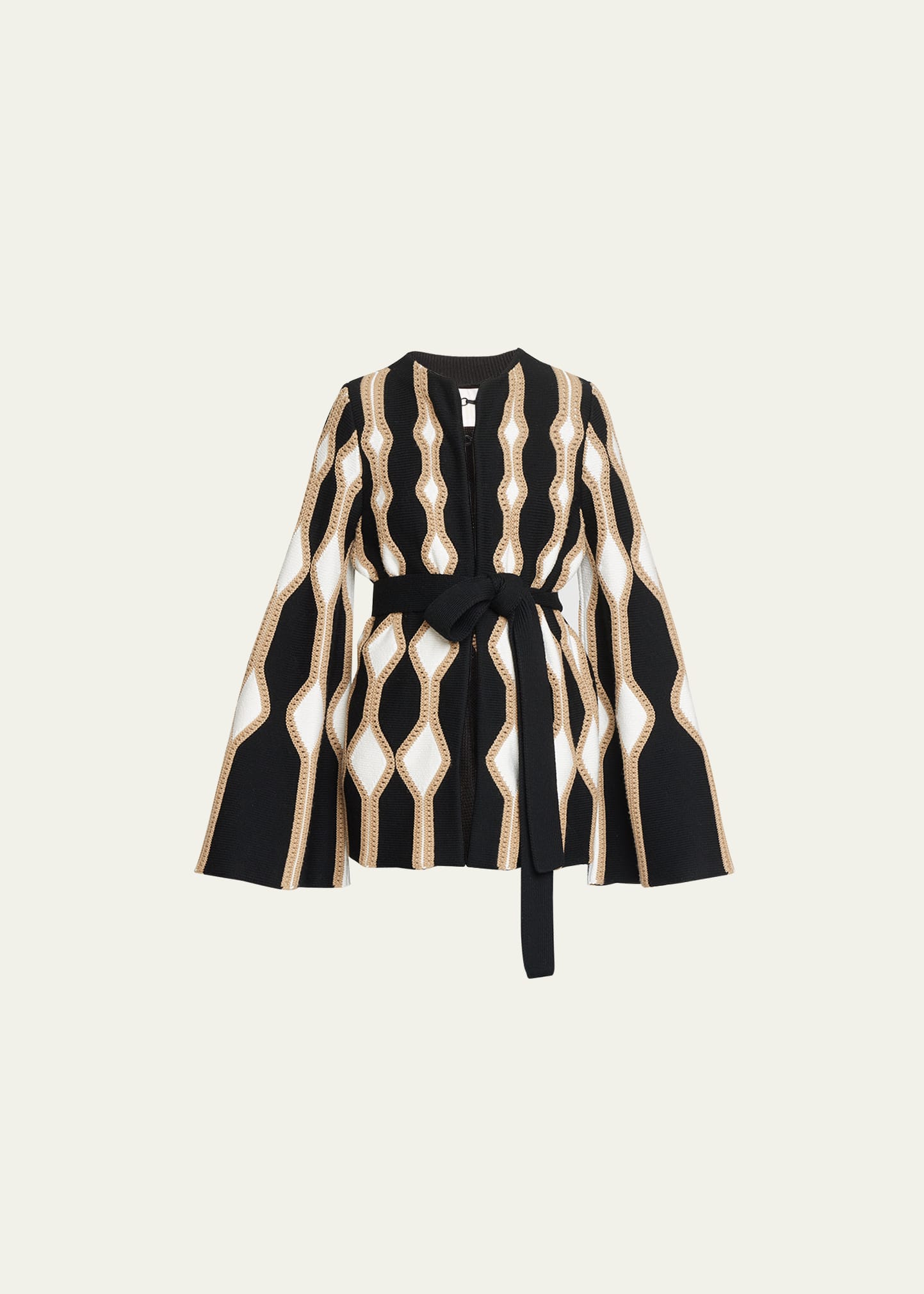 Chloe "Renaissance" colorblock intarsia cardigan with self-tie waist belt Round neckline; hook closure Long sleeves Relaxed fit Wool/silk Professional cleaning recommended Made in Italy