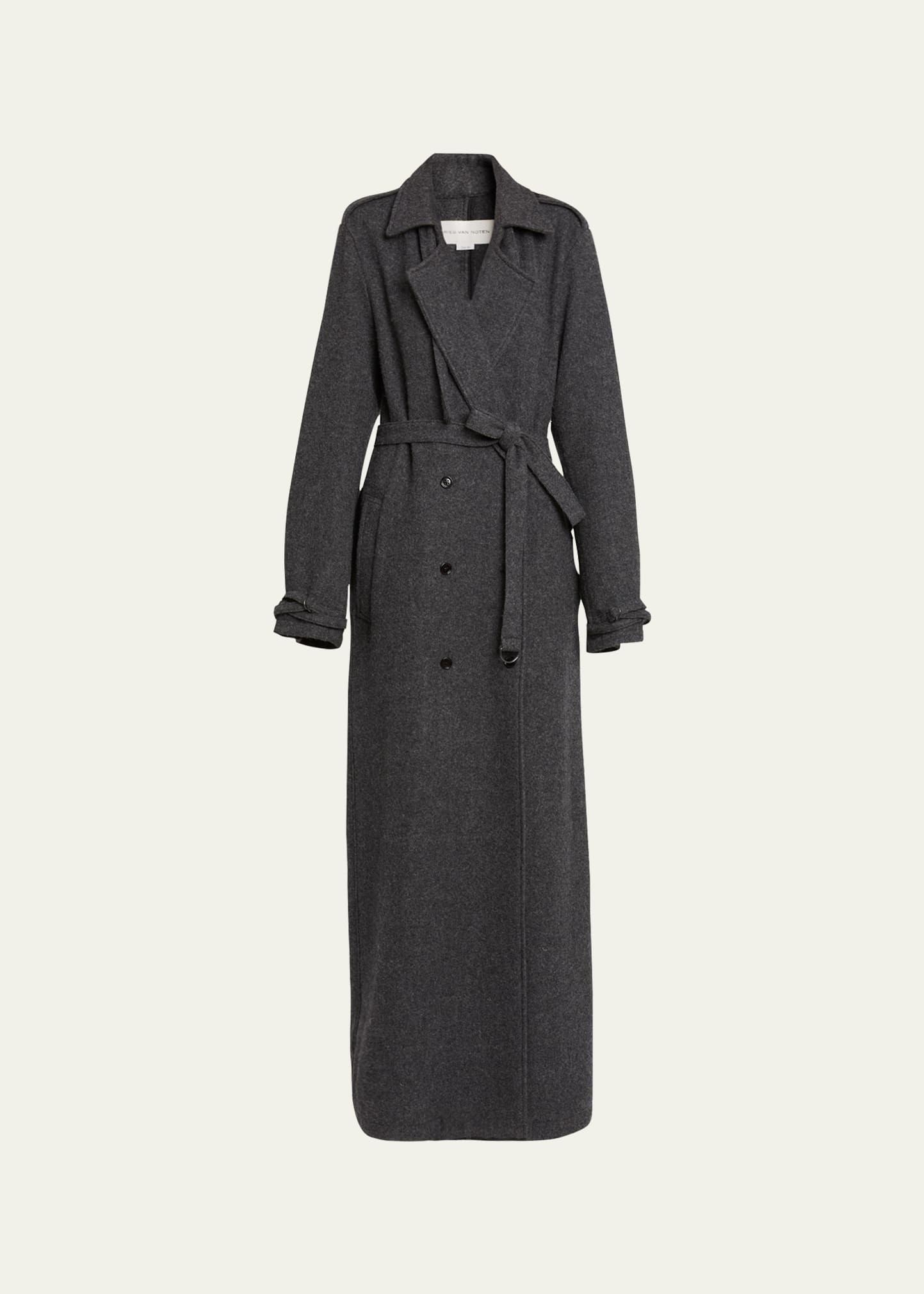 Dries Van Noten "Renwicks" gabardine coat Notch lapels; double-breasted Long sleeves; belted cuffs Side slip pockets Shoulder epaulettes Self-tie waist Straight fit Long length Wool Unlined Dry clean Made in Bulgaria