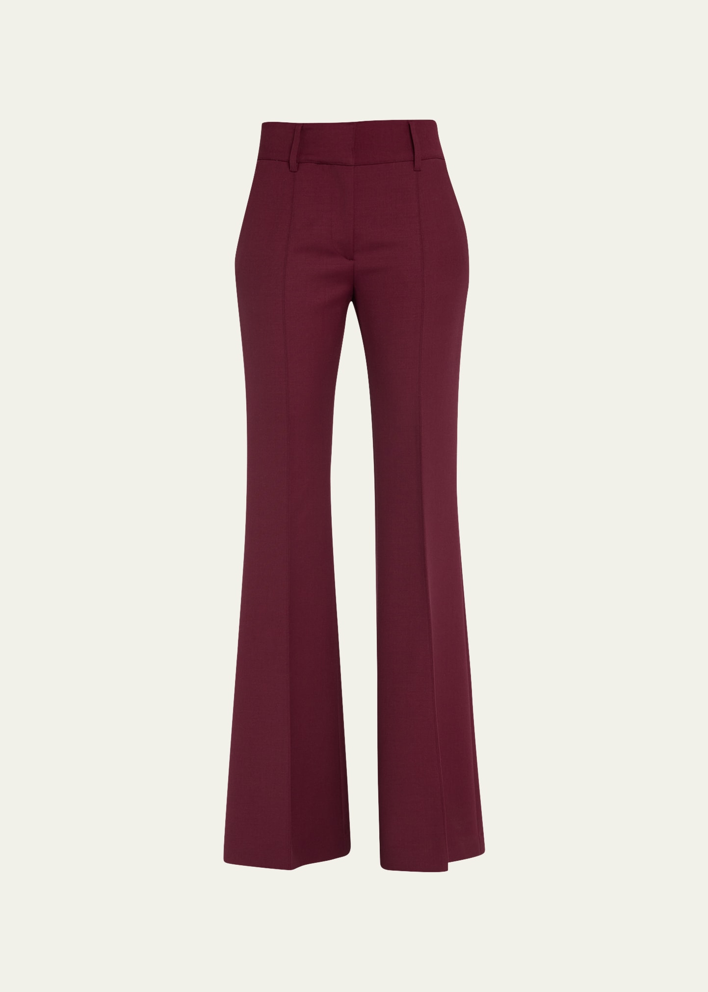 Gabriela Hearst "Rhein" flared trouser pants High rise Pleated front Hook/zip fly; belt loops Side slip pockets; back welt pockets Flared legs Full length Relaxed fit Wool Made in Italy