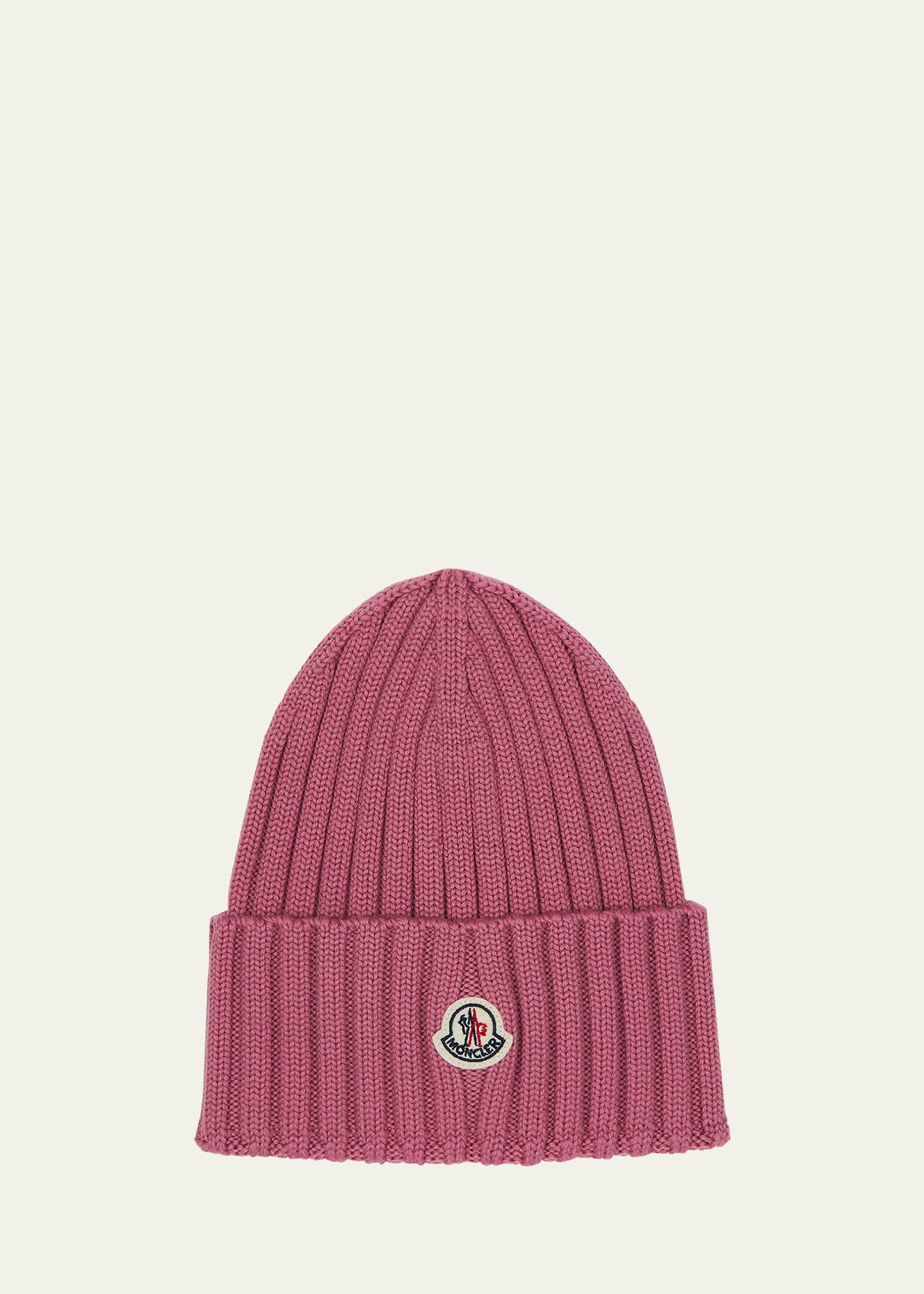 Moncler ribbed knit beanie with a signature logo patch at front Round crown Foldover brim Virgin wool Dry clean Imported