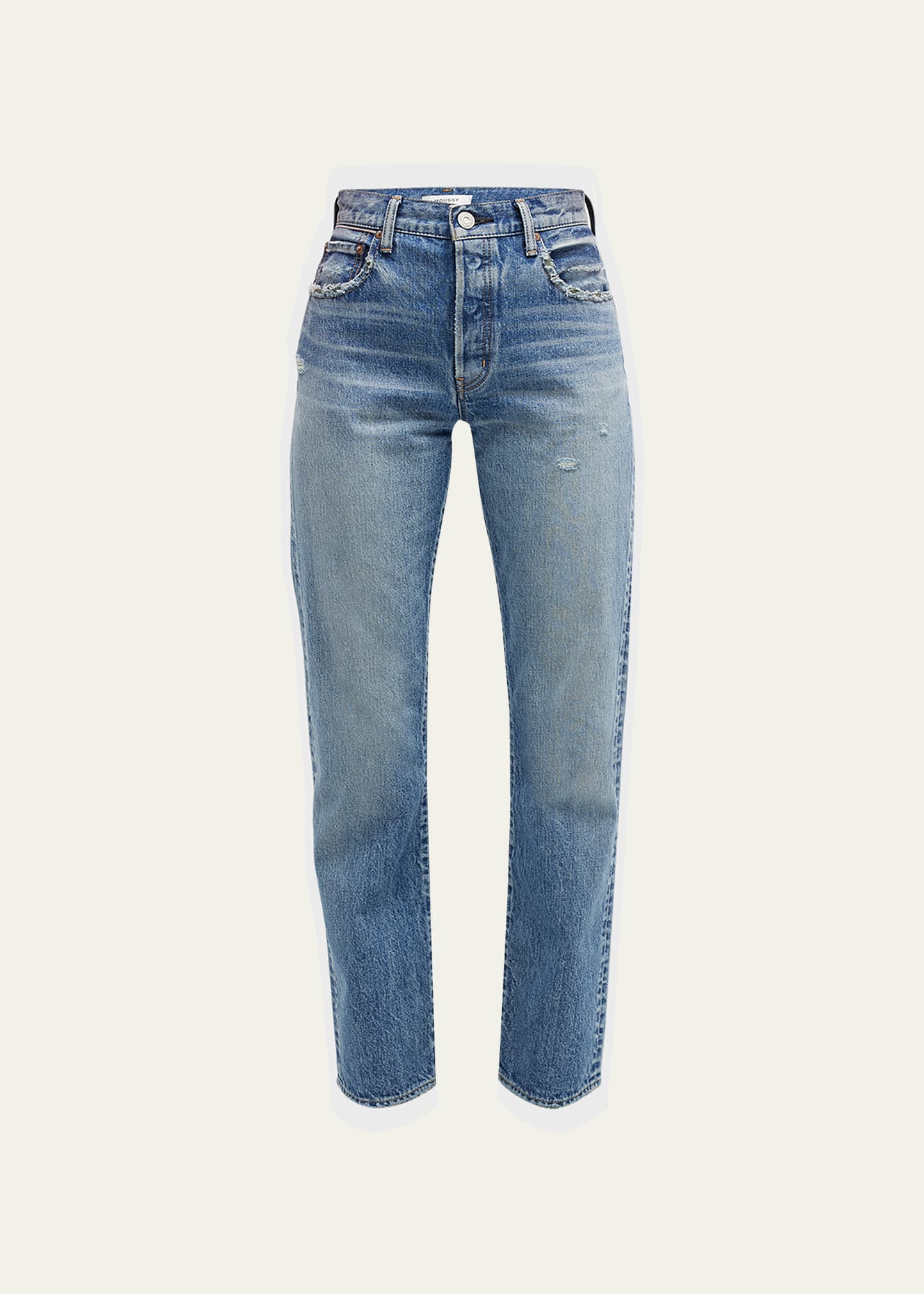 MOUSSY VINTAGE "Ridgemont" straight-leg jeans with slight distressing in a faded, medium-wash denim Approx. 10.6" rise; 29.9" inseam Five-pocket style High rise Loose fit Ankle length Button/zip fly; belt loops Cotton Machine wash cold Imported