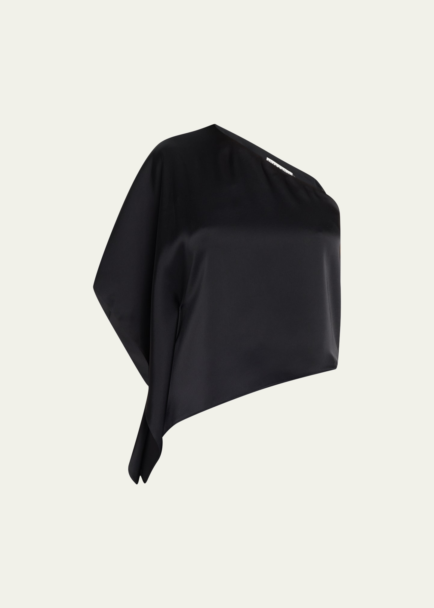 Alice + Olivia "Rico" satin blouse embellished with a crystal-accented strap Approx. 28"L from shoulder to hem One shoulder neckline Half flowy sleeve Easy fit Cropped length Asymmetric hem Slipover style Triacetate/polyester Lining: Polyester Imported