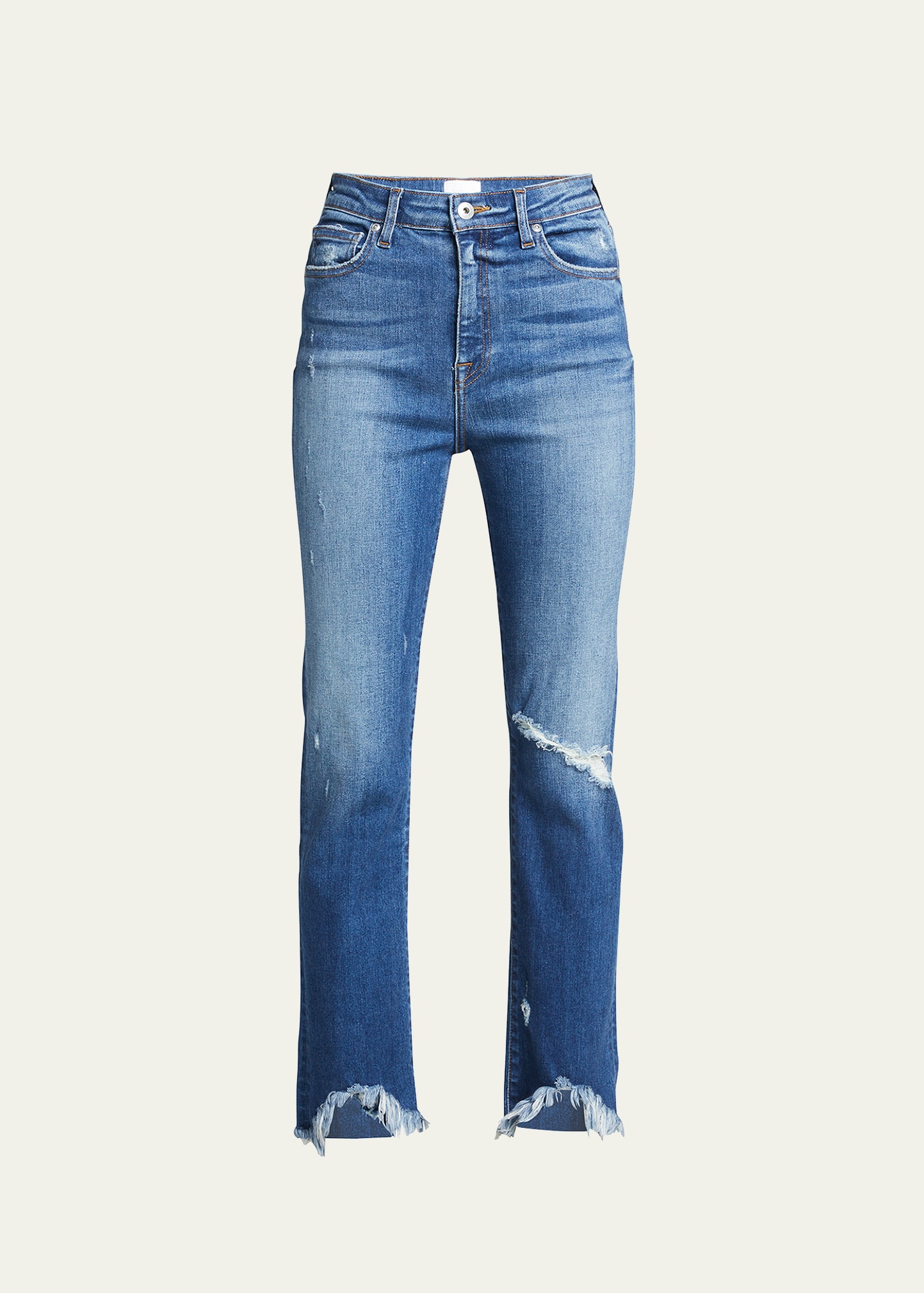 Jonathan Simkhai Standard "River" jeans crafted from medium-wash denim with distressing and frayed hems Approx. 27" inseam Cropped at the ankle High rise Button/zip fly; belt loops Five-pocket style Straight legs Cotton/elastane Made in USA