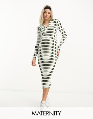 River Island Maternity polo jersey body-conscious midi dress in cream and green stripe-White