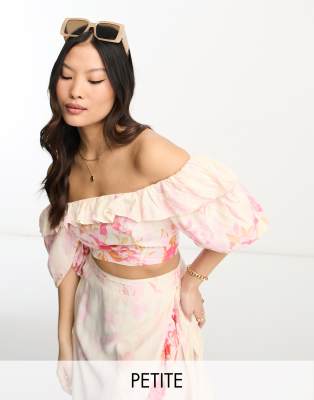 River Island Petite ruffle bardot crop top in pink floral - part of a set-Yellow