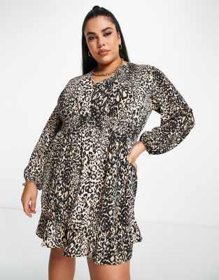 River Island Plus elastic waist ruffle mini dress in brown animal