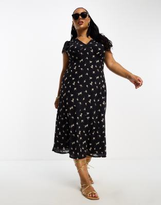 River Island Plus midi tea dress with ruffle sleeves in black