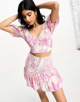 River Island printed shirred detail mini beach skirt in pink - part of a set-Purple