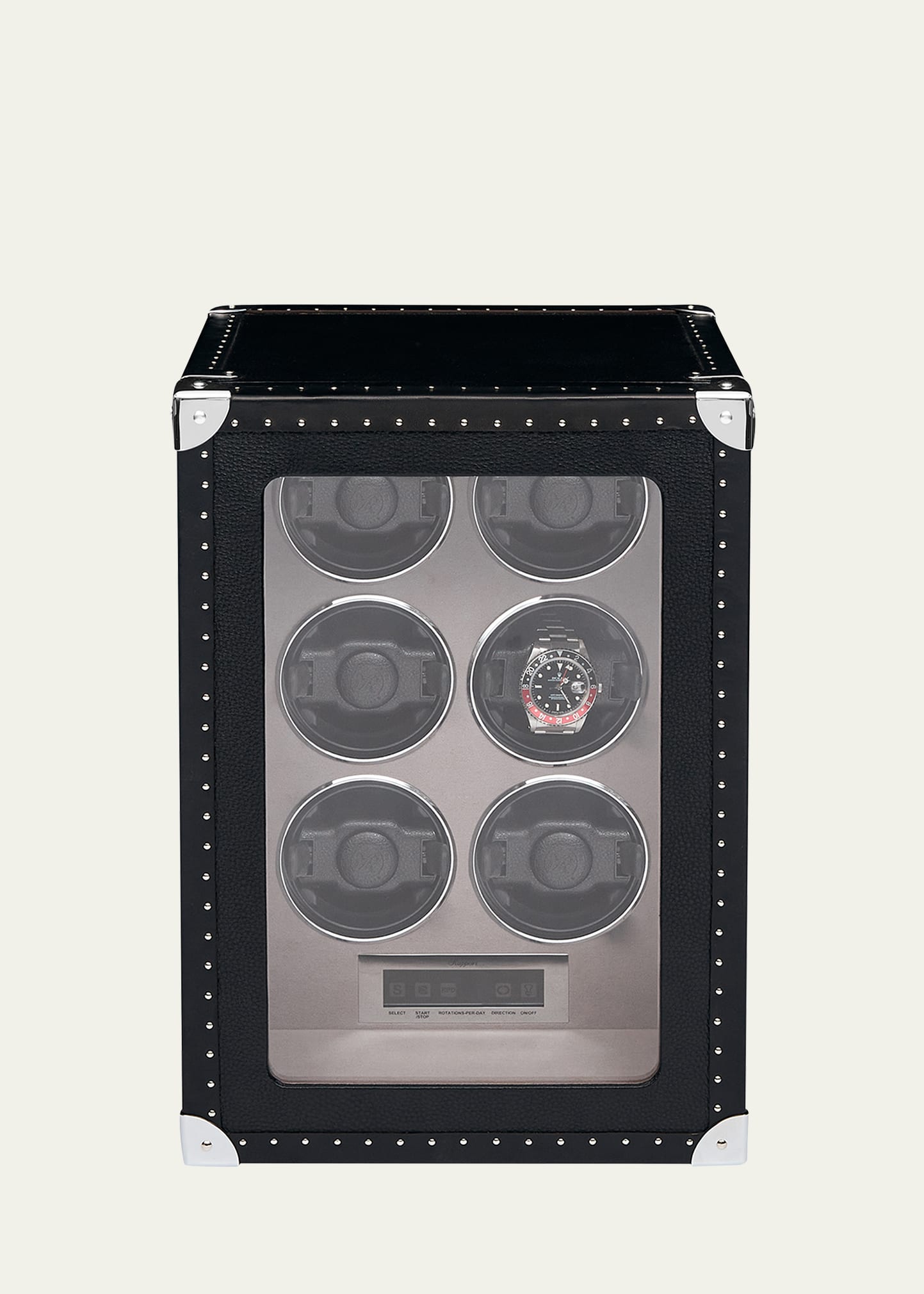 NEW DESIGN Leather-covered watch winder features fingerprint access and LCD touchscreen control panel Clear panel on door front Hinge door Six individual watch cups Approx. 10.6"W x 9.8"D x 15.3"T Lining, suede Item Weight (Lbs.): 20.0 Made in United Kingdom