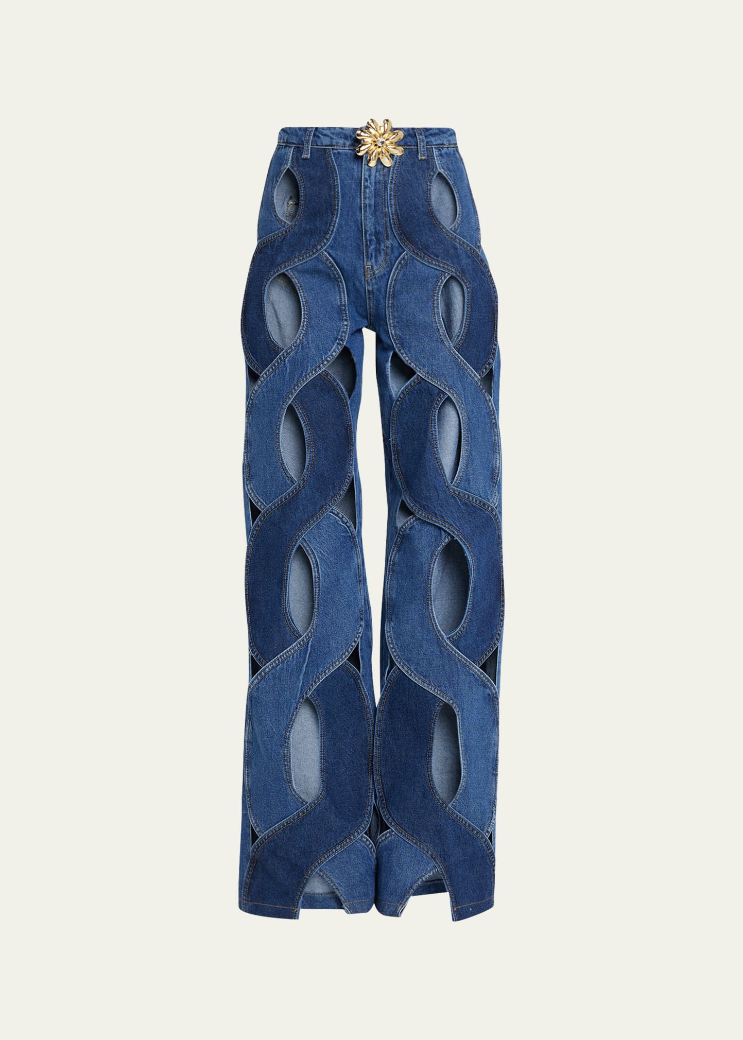 AREA denim jeans with rope cutout detail High rise Side slip pockets; back patch pocket Wide legs Full length Button/zip fly; belt loops Cotton self/lining Imported