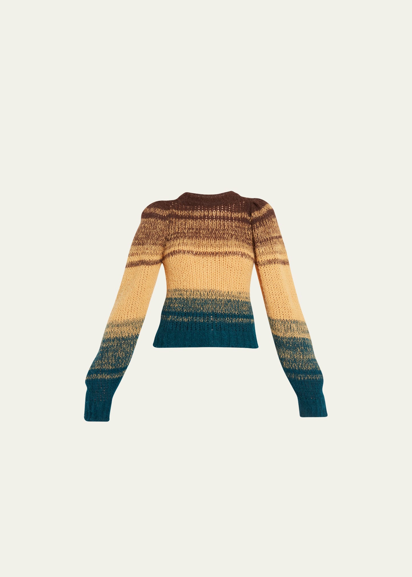 Ulla Johnson "Rosalia" sweater in variegated stripe degradé knit Approx. 21"L from shoulder to hem Crew neckline Long puff sleeves; approx. 30.3"L Fitted Ribbed cuffs and hem Pullover style Wool Dry clean Made in Peru