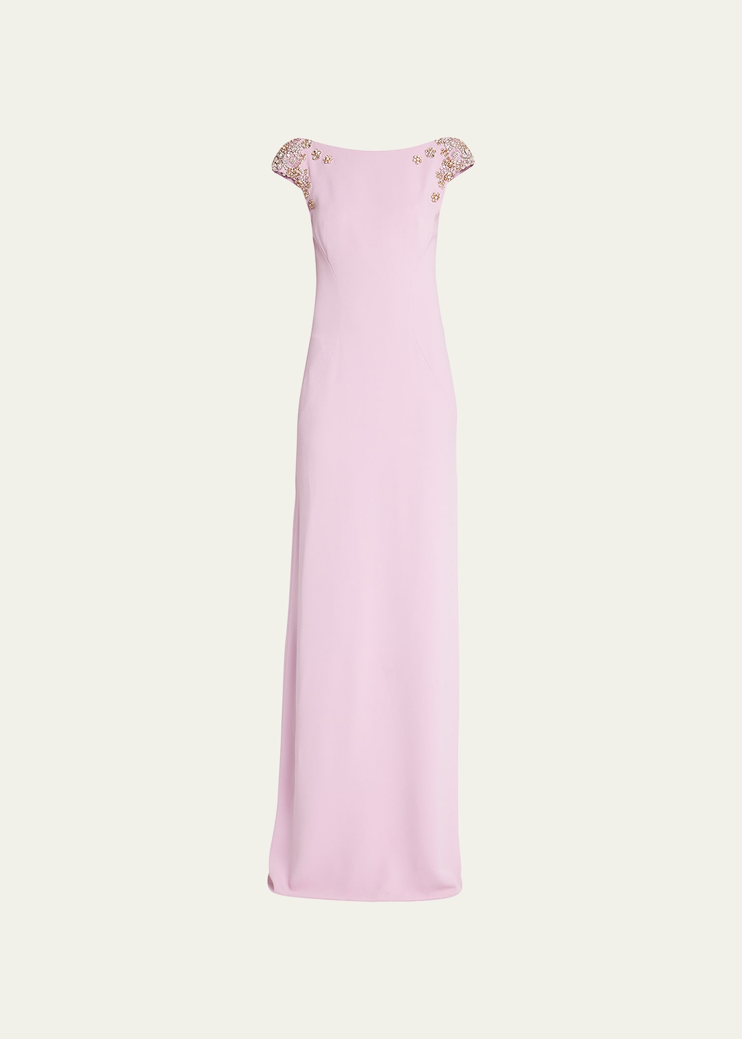 Jenny Packham "Rosamund" gown featuring crystal embellishment at the shoulders High neckline; dropped back Short sleeves Concealed back zip Column silhouette Polyester/elastane Lining: Polyester Dry clean, professional cleaning recommended Imported