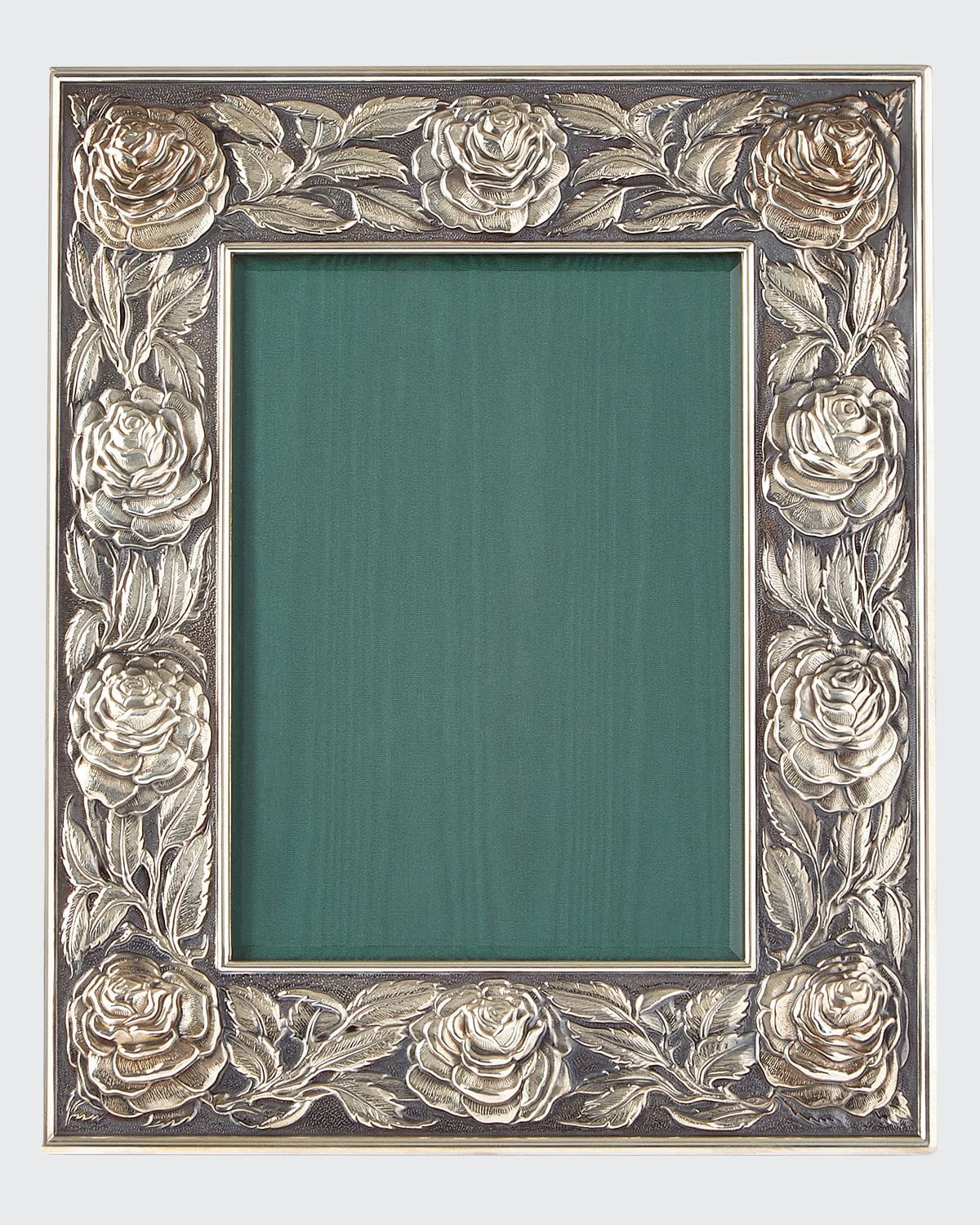 Hand-finished rose frame. 9.1"W x 11"T; holds 5" x 7" photograph. Intricately detailed solid sterling silver. Beveled glass. Moir lining. Leather back. Easel back; stands vertically or horizontally. Made in Italy.