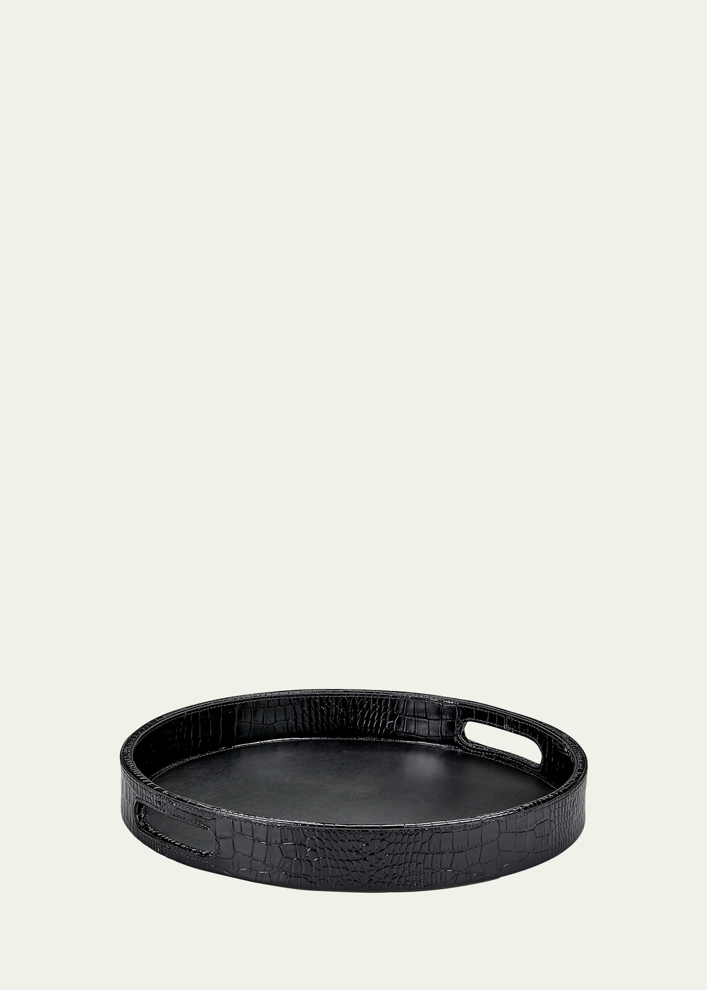 Round tray is crafted of croc-emboosed leather Cut-out handles Approx. 14"Dia Made in USA from imported materials
