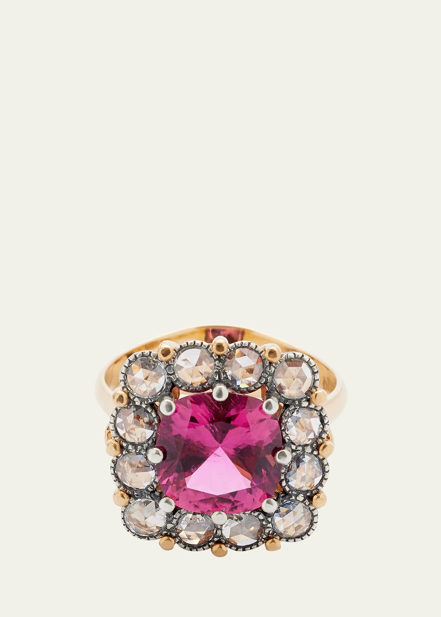 Arman Sarkisyan ring 22-karat yellow gold Prong-set rubellite cushion Diamonds set in sterling silver Rubellite total carat weight: 2.80 Diamond total carat weight: 0.82 Made in USA