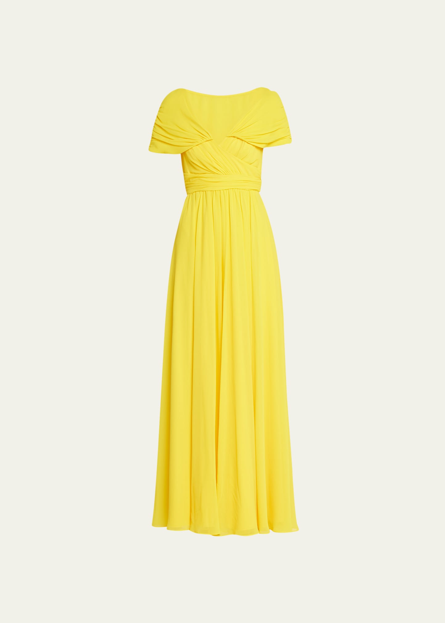 Badgley Mischka Collection ruched gown with crossover bodice V neckline Short sleeves Empire waist Floor-length A-line silhouette Invisible back zipper Polyester Lining: Polyester Dry clean Imported