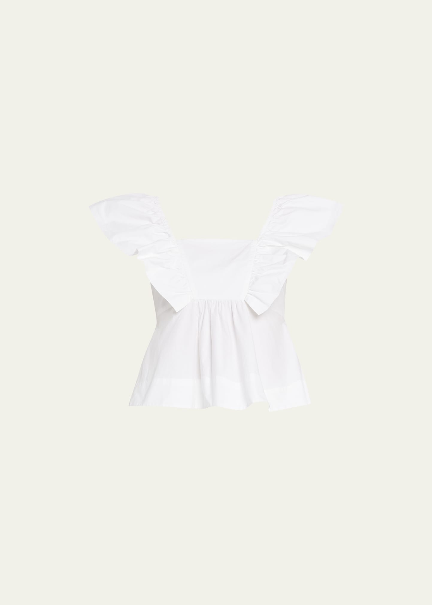 Crafted of cotton poplin, this blouse from GANNI features a square neck, ruffled cap sleeves, and a ruched back. Square neck Ruffled cap sleeves Ruched back Pulls over 100% cotton Machine wash Imported SIZE & FIT About 21" from shoulder to hem Model measurements: 5'10" tall Model is wearing a US size 4