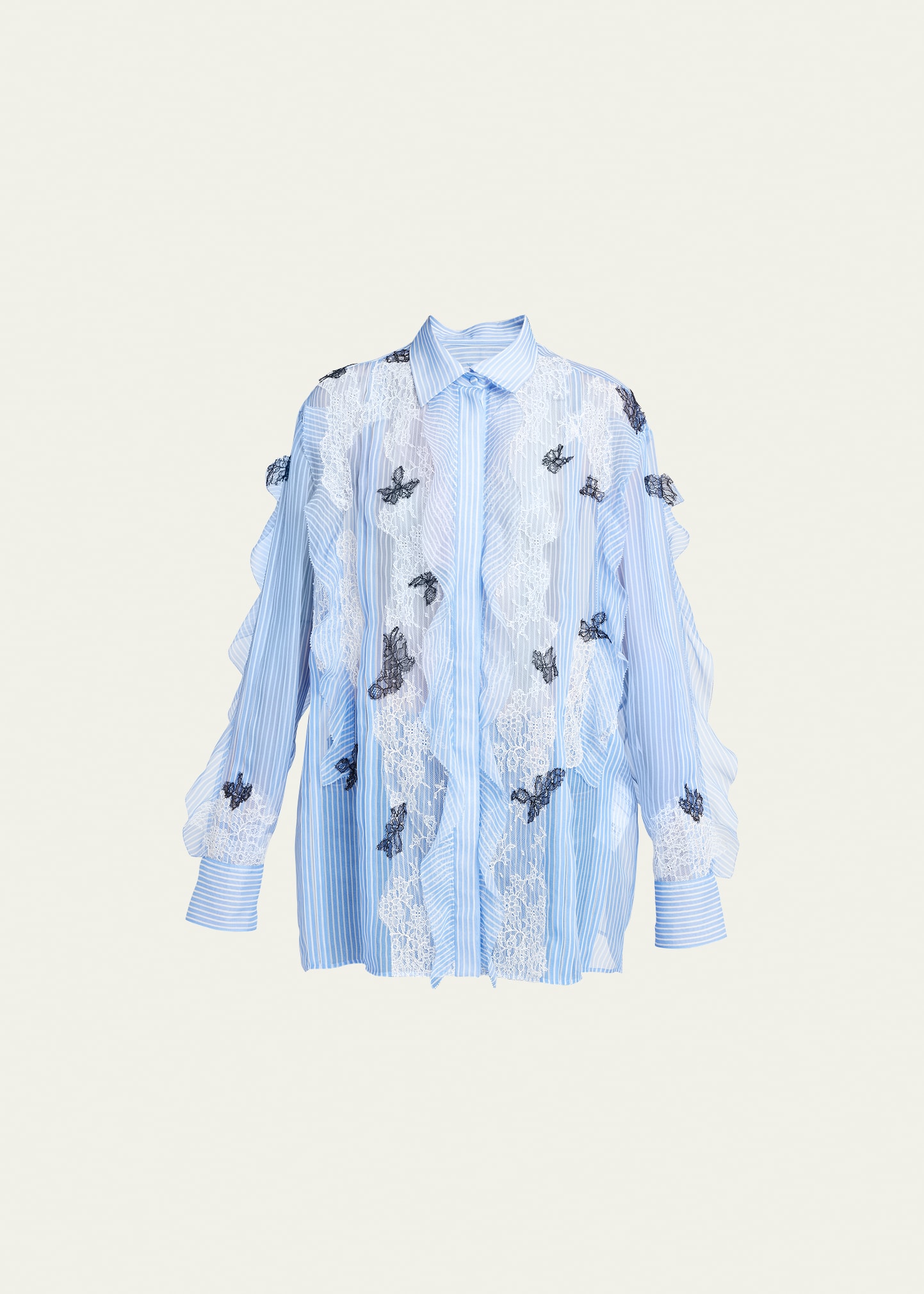 Valentino Garavani sheer stripe blouse features butterfly applique with lace insets and ruffle trim Spread collar; covered button placket Long sleeves; button cuffs Back yoke Relaxed fit Silk Made in Italy