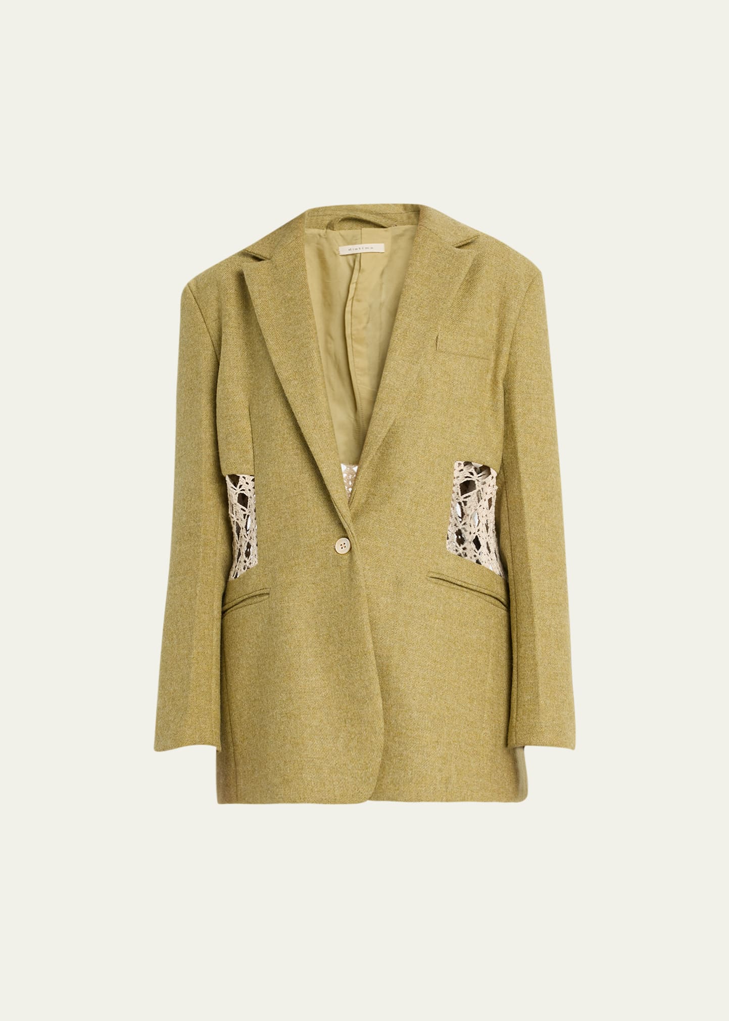 DIOTIMA "Rupture" tailored jacket with handmade crochet panel through torso Notch lapels; button front Long Sleeves; button cuffs Chest welt pocket; hip welt pockets Oversized fit Double-vented back Wool/cotton Rayon lining Professional cleaning recommended Made in USA