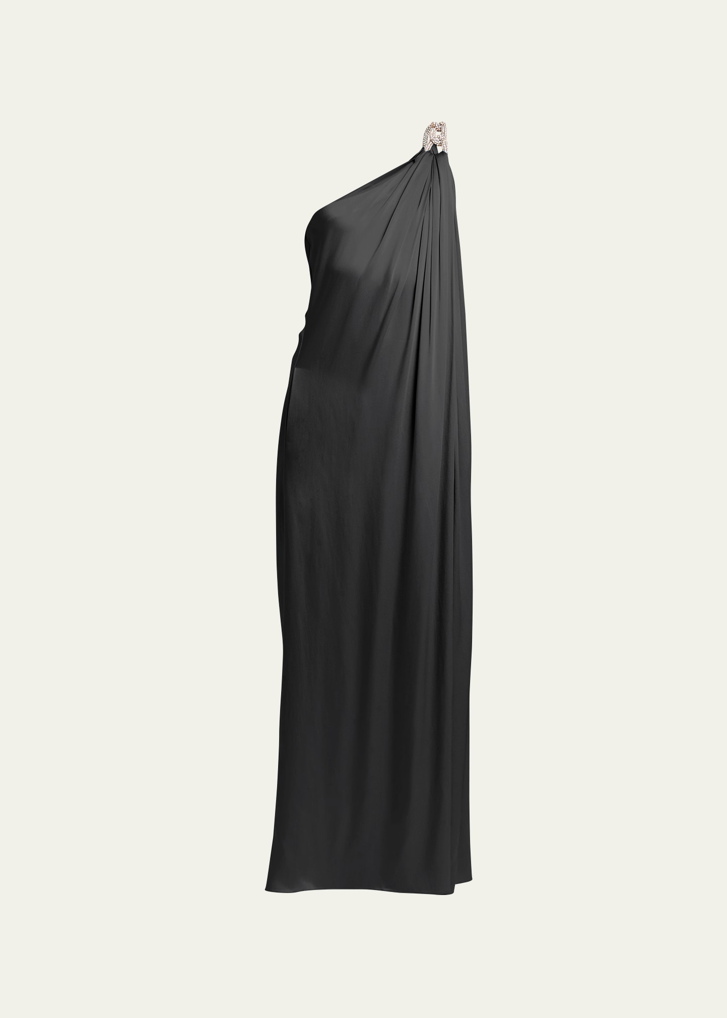 Stella McCartney draped satin gown features embellished chain detailing at the shoulder One-shoulder neckline Sleeveless Left leg high slit Full length Column silhouette Viscose/acetate Made in Hungary