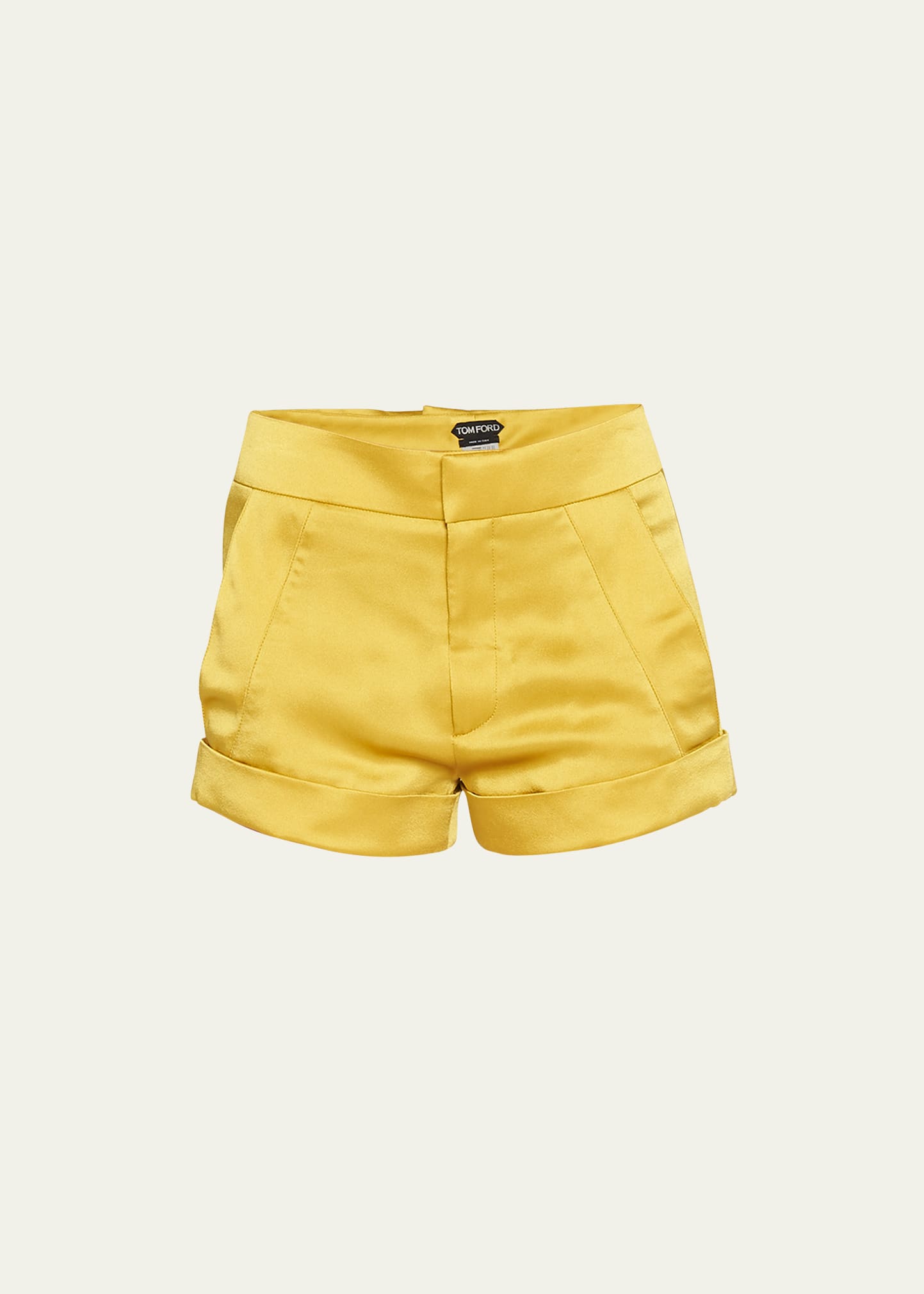 TOM FORD satin shorts with a rolled cuff at the hem Mid-rise Hook/zip fly Side slip pockets; back welt pockets Semi-fitted Acetate/viscose Lining: Viscose/polyester Made in Italy