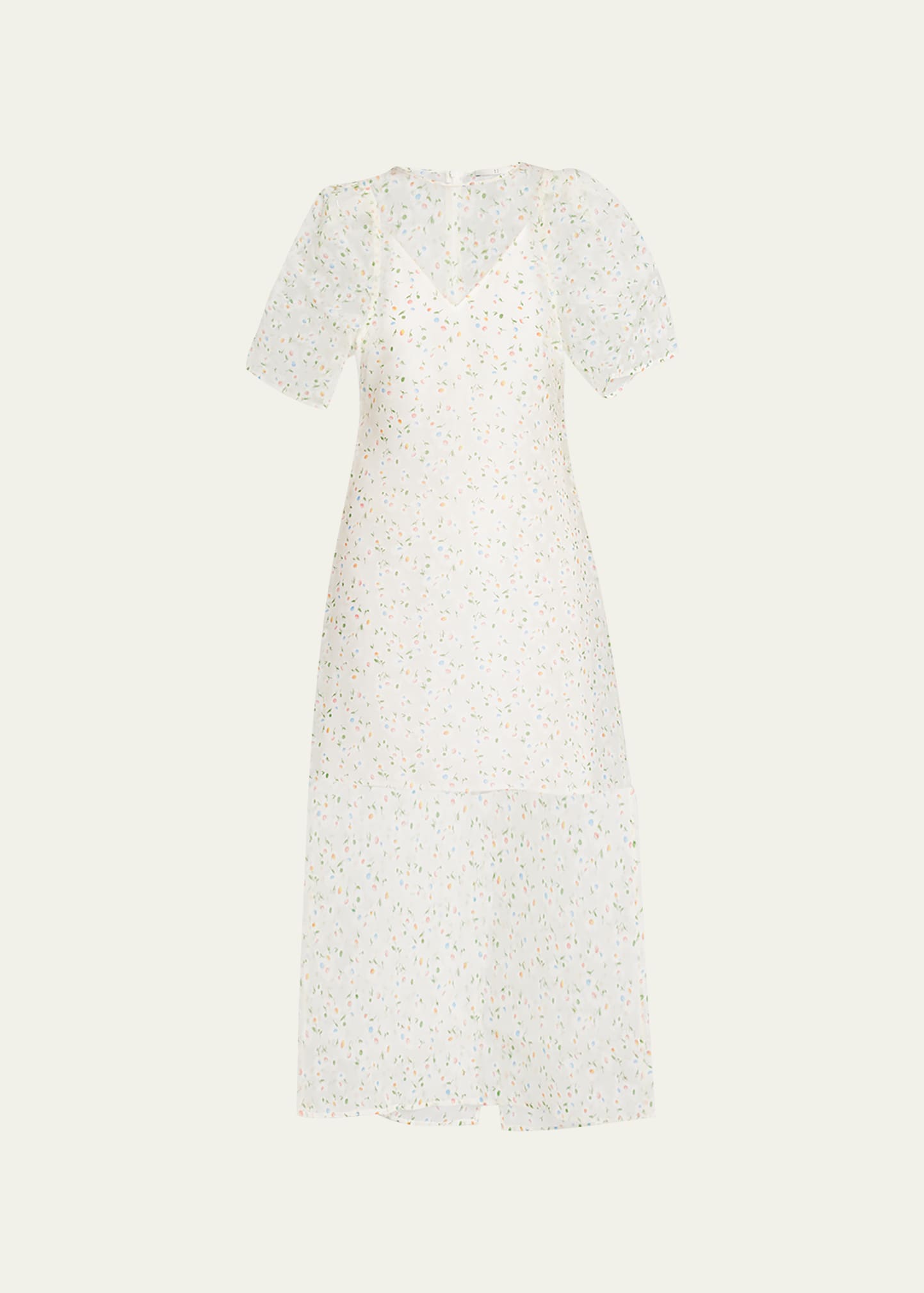 Rohe sheer midi dress with a lined slip dress in a floral-printed silk-organza High crew neckline Short puff sleeves Slip silhouette Hem falls below the knee Back zipper Silk Dry clean Imported
