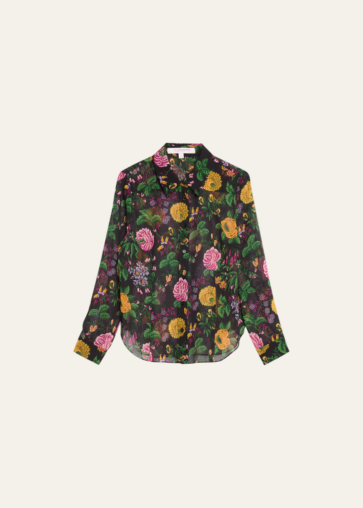 Carolina Herrera semi-sheer button-front shirt in an allover floral printed styling Spread collar Long sleeves; button cuffs Back yoke Hip length Tailored silhouette Polyester Unlined Dry clean Made in Italy