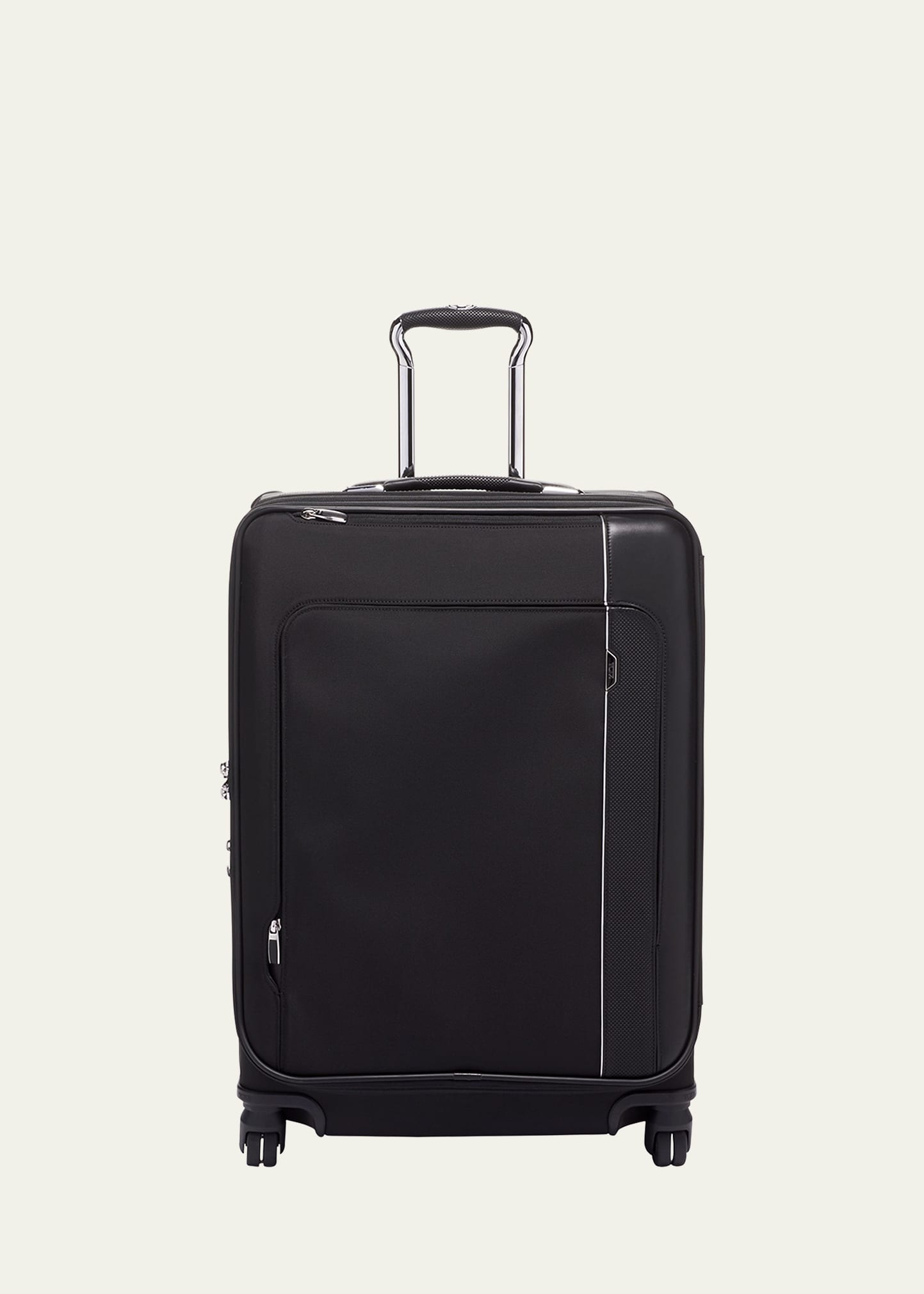 Luggage is made of carbon fiber, leather, and polyester Front-lid zip entry Large front U-zip pocket; magnetic zipper pull Top and side carry handle Bottom grab handle Three-stage telescoping handle Interior zip divider Interior mesh zip pocket Two interior zip pockets Card pocket Hanger bracket Compression straps Removable suiter sleeve to keep one suit in shape; zip pocket Two shoe bags with drawstring closure Four recessed dual-spinning wheels Protecti.