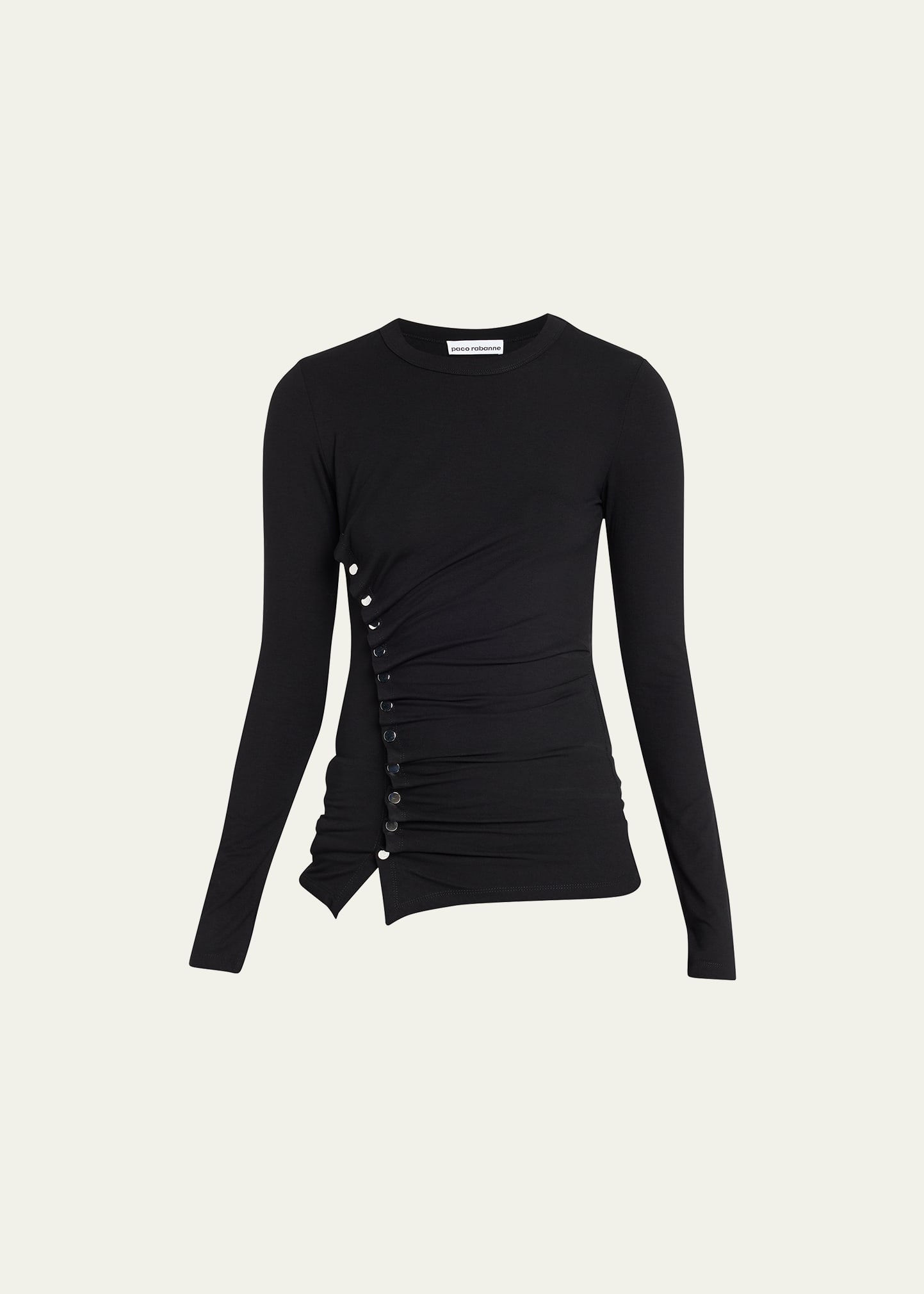 Paco Rabanne drape jersey top with side snap detail Crew neckline Long sleeves Slim fit Pullover style Viscose/elastane Made in Portugal