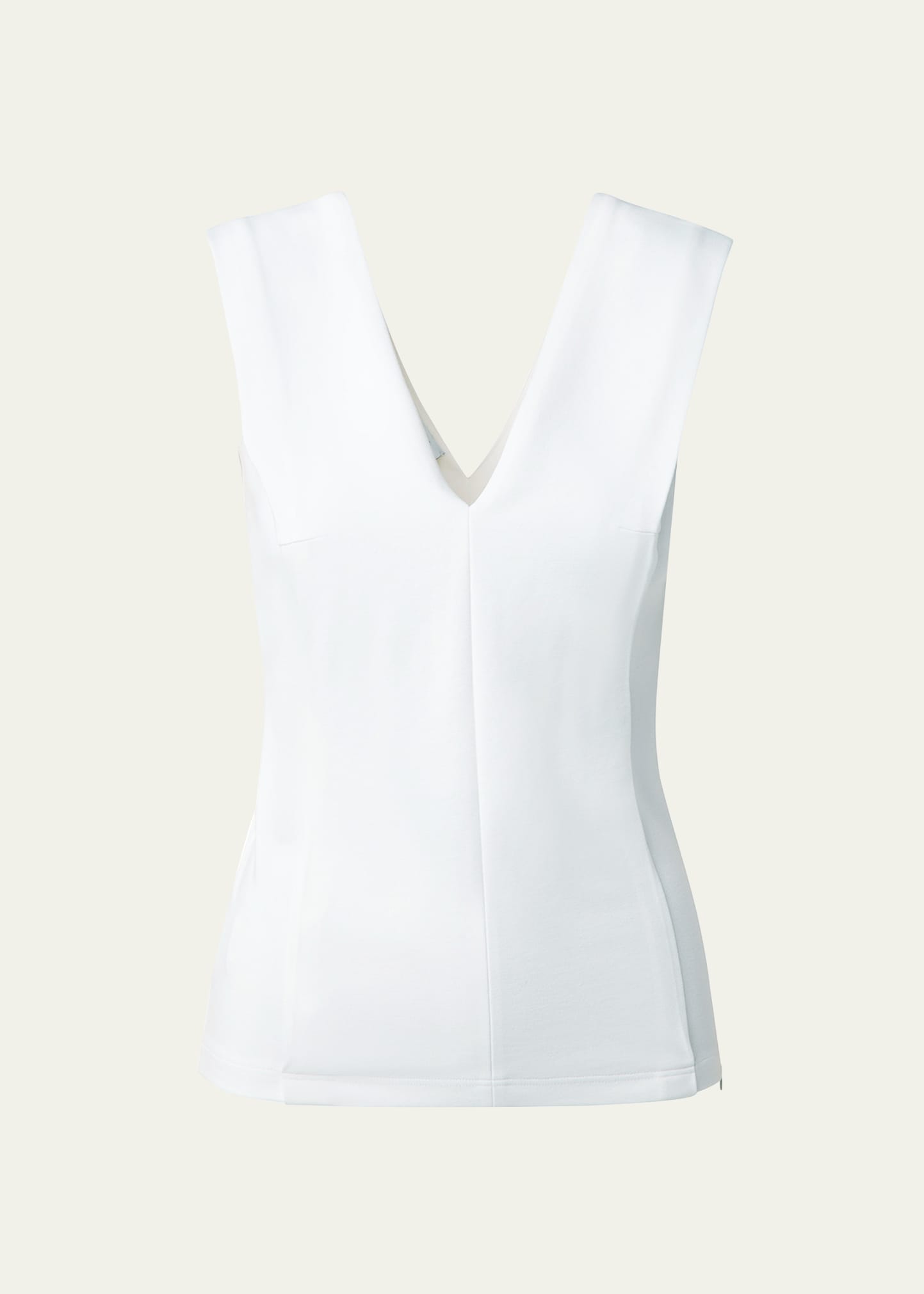 Akris punto signature jersey top with a front and back v-neckline and a folded front detial Sleeveless Side zipper seam Hip length Fitted silhouette Viscose/spandex Made in Romania