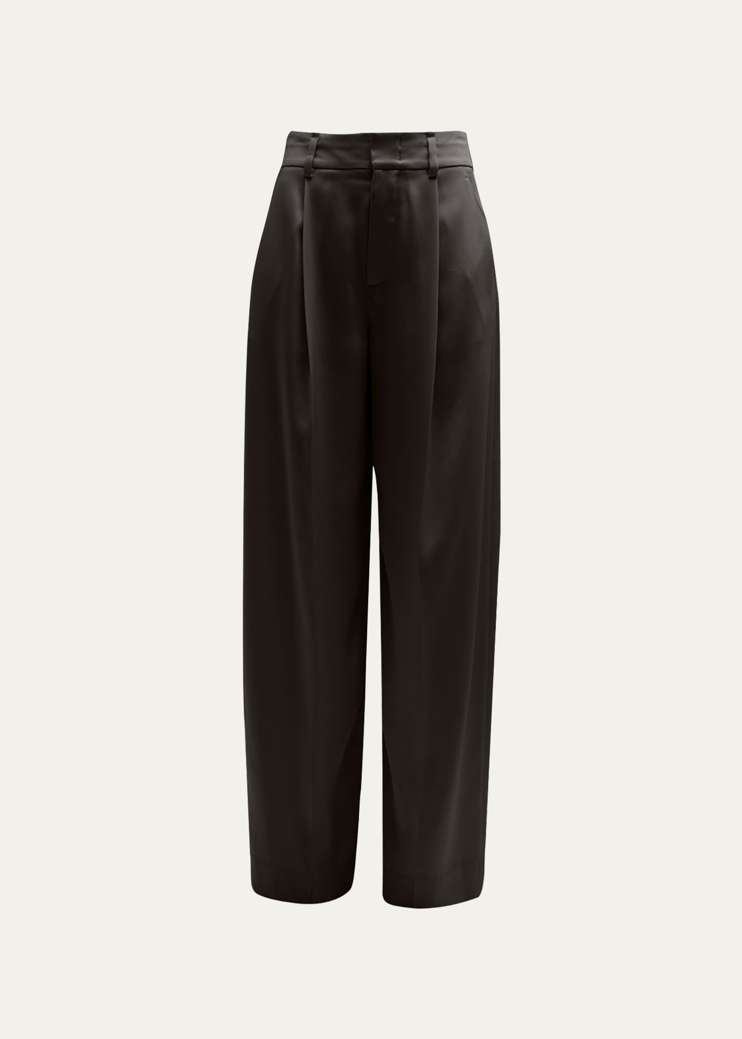 Vince satin pants with a pleated front Mid rise sits high on hip Front slant pockets; back welt pockets Relaxed, wide legs Full length Button/zip fly; belt loops Silk Imported
