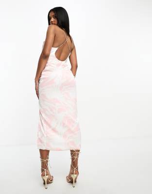 Simmi satin ruched front diamante detail midi dress in pink multi