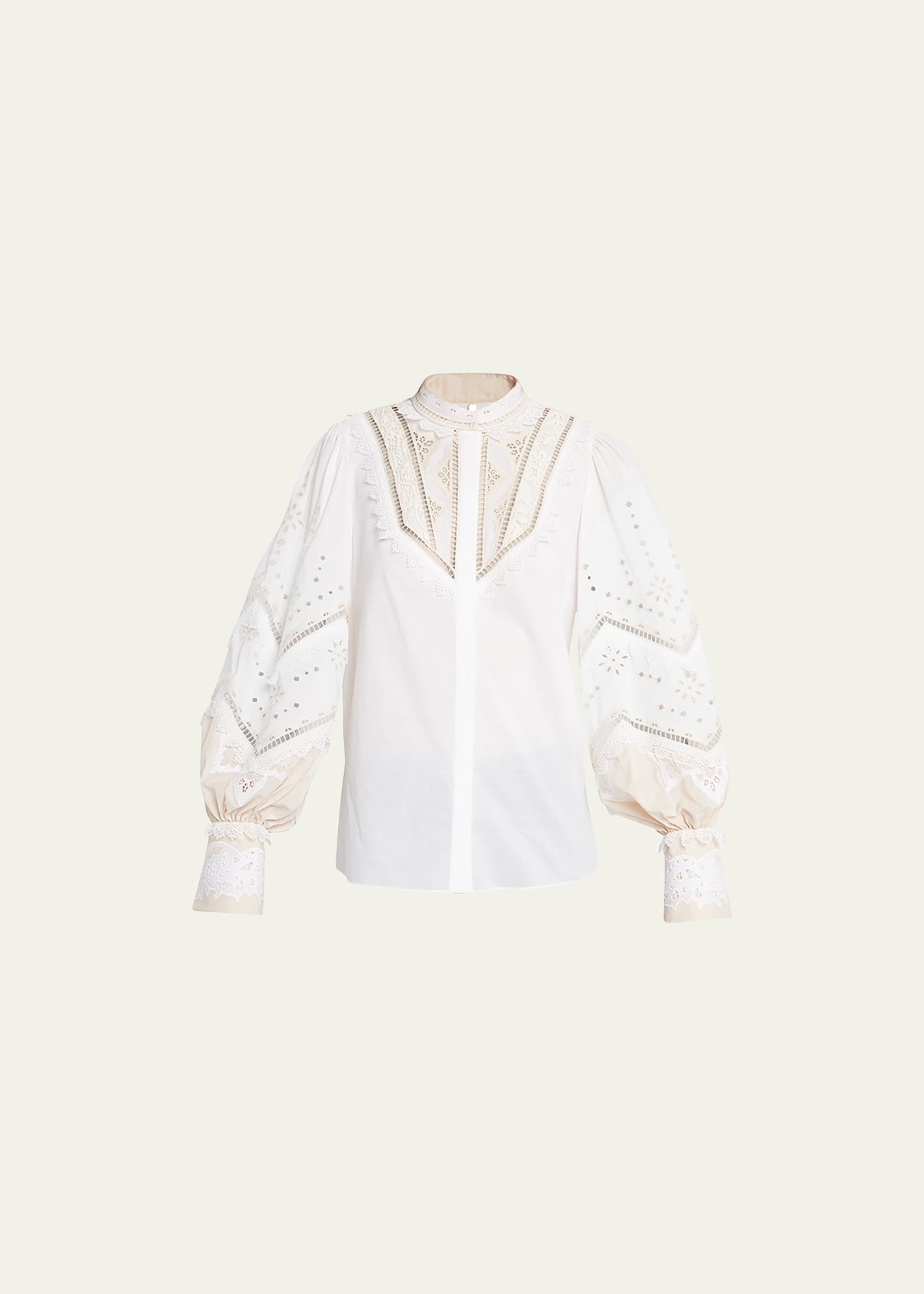 Kobi Halperin "Skylar" cotton blouse with embroidered cutouts, scalloped lace trim, and lattice lace inset Approx. 26.5"L from shoulders to hem Band collar; hidden button front Long blouson sleeves Split cuffs Inverted pleat at back yoke Relaxed fit Cotton Imported