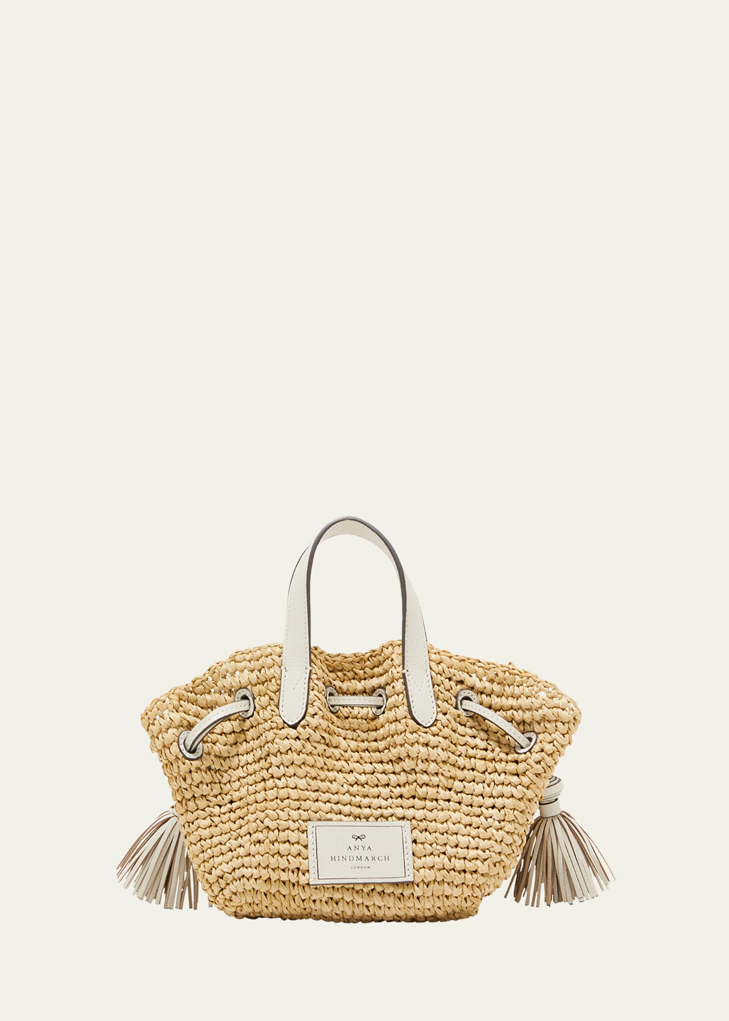 Anya Hindmarch lightweight tote bag in raffia and leather Flat top handles Detachable, adjustable crossbody strap Can be worn as a top handle or crossbody bag Side tassel drawstring Open top with magnetic closure Approx. 6.4"H x 13.5"W x 4.1"D Wipe clean Imported
