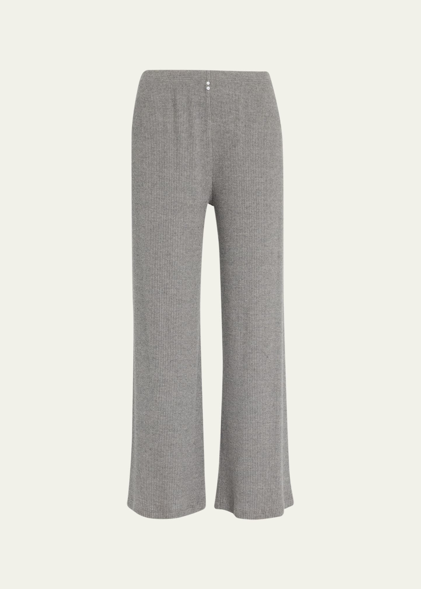 Andine "Soleil" brushed pants in ribbed fabric Approx. measurements: 11.3" rise; 27.5" inseam; 37" outseam Two mico buttons at front High rise waist Elasticized waistband Cropped at the ankle Relaxed legs Pull-on style Modal/polyester/spandex Machine wash cold Made in the USA