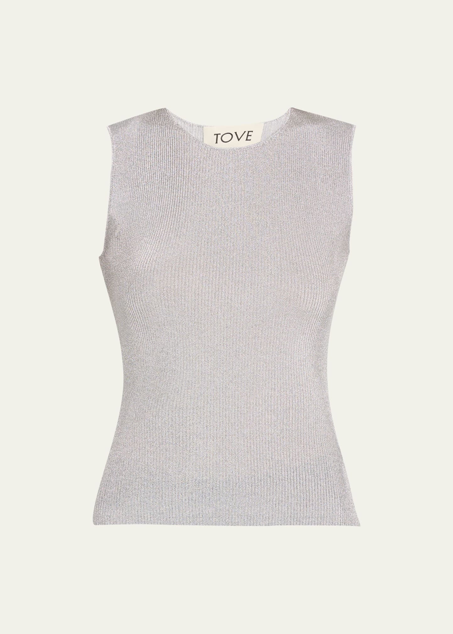Tove "Sou" ribbed-knit tank top Crew neckline Sleeveless Fitted silhouette Hem sits at the hip Pullover style Viscose/metallic Imported