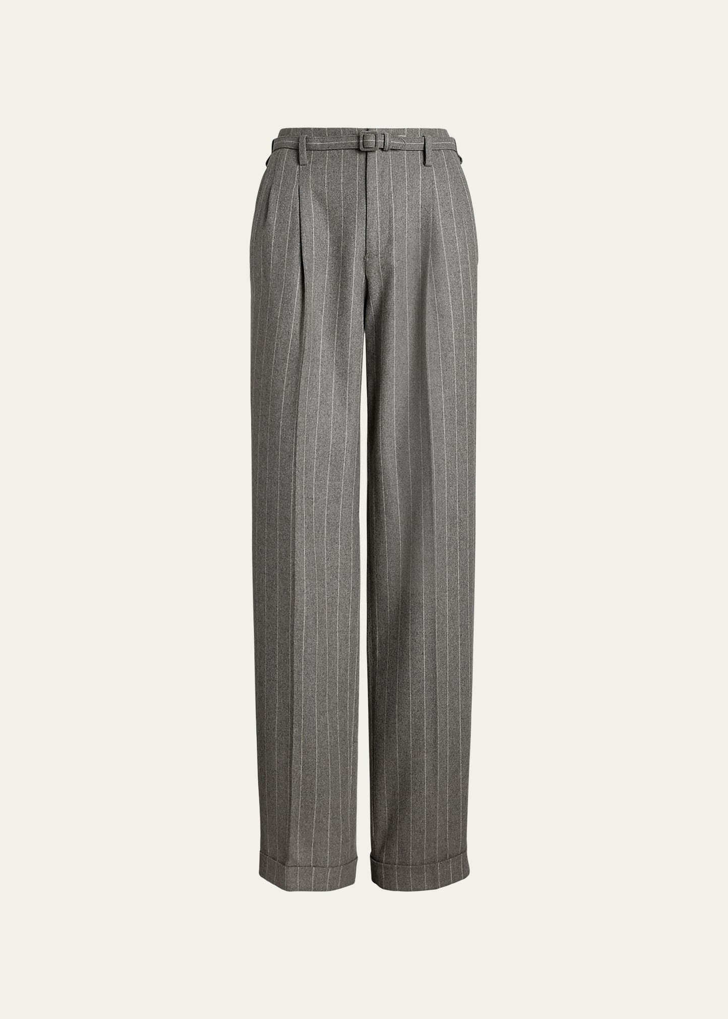 Ralph Lauren Collection "Stamford" flannel pants in chalk stripe motif with front waist pleats High rise Straight legs Removable self-belt Full length Cuffed hem Tab/zip fly; belt loops Wool Viscose/elastane lining Leather trim Made in Portugal