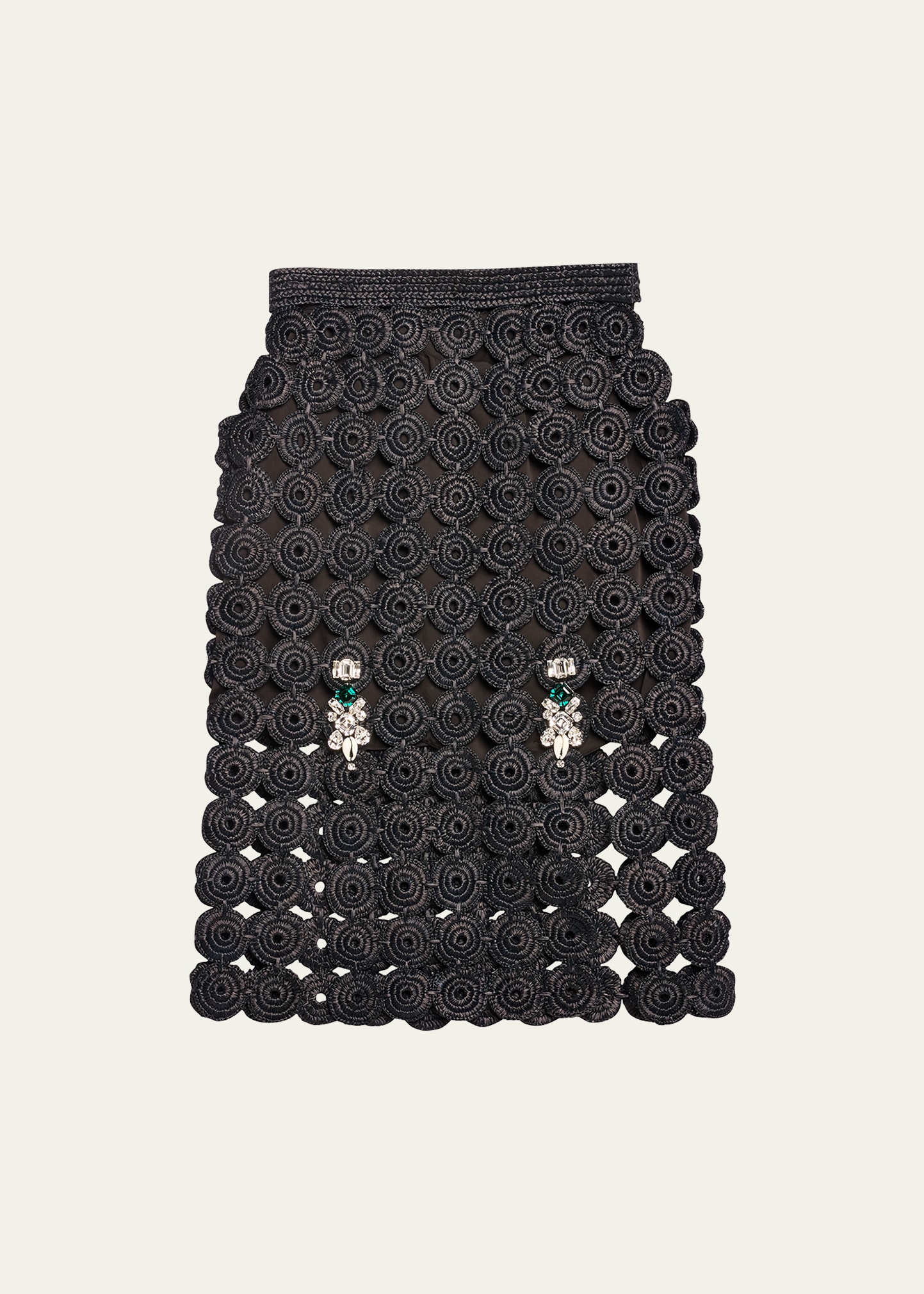 Wales Bonner "Stanza" crochet knit skirt adorned with crystal embellishments High-rise waistband Hem falls below the knee Skirt falls straight from hip to hem Slip-on style Viscose Dry clean Imported