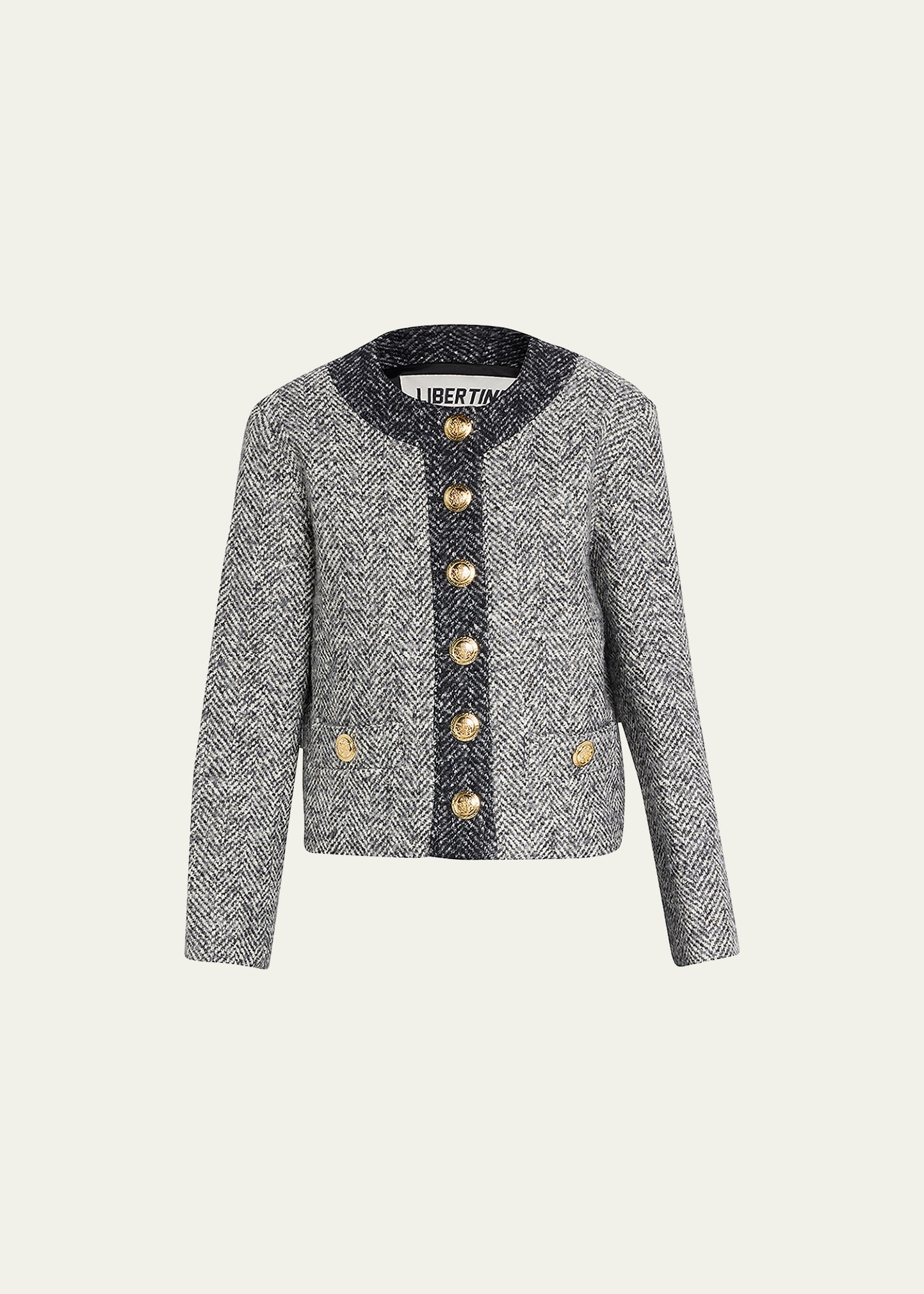 Libertine "Star Dust" grey Deneuve jacket with gold-tone button details Round collar Button front Long sleeves Front slip pockets Hip length Relaxed fit Virgin wool/polyester Lining: Polyester Dry clean Made in the USA
