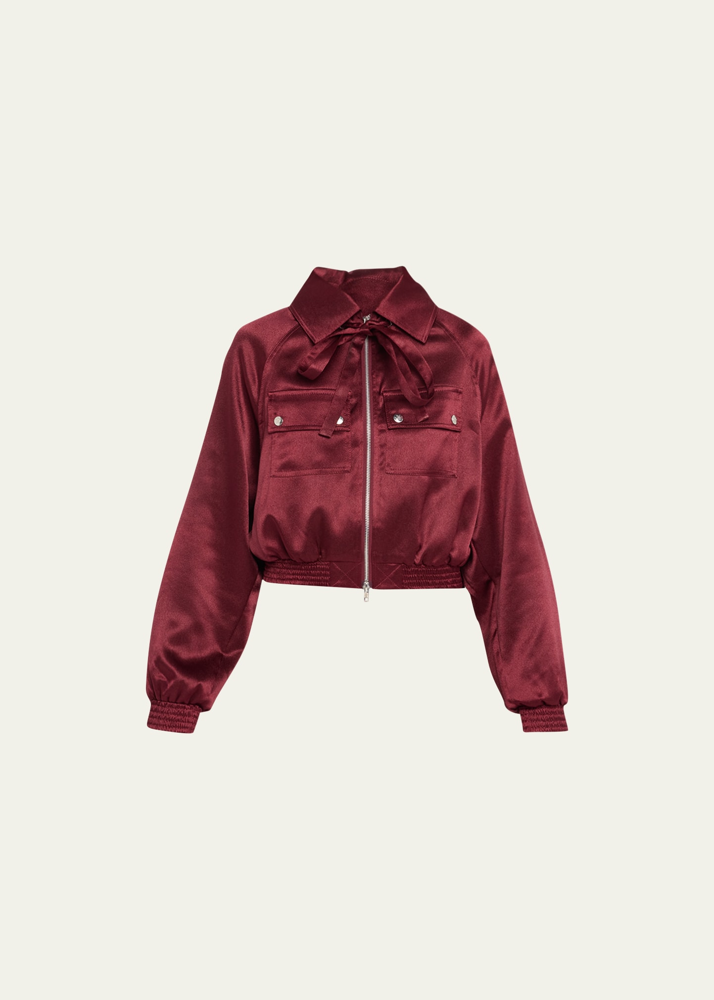 Thebe Magugu satin bomber jacket with stole back and neck tie Spread collar; two-way zip front Long sleeves Chest flap-buttoned pockets Relaxed fit Cropped length Elasticized hem Polyester Imported