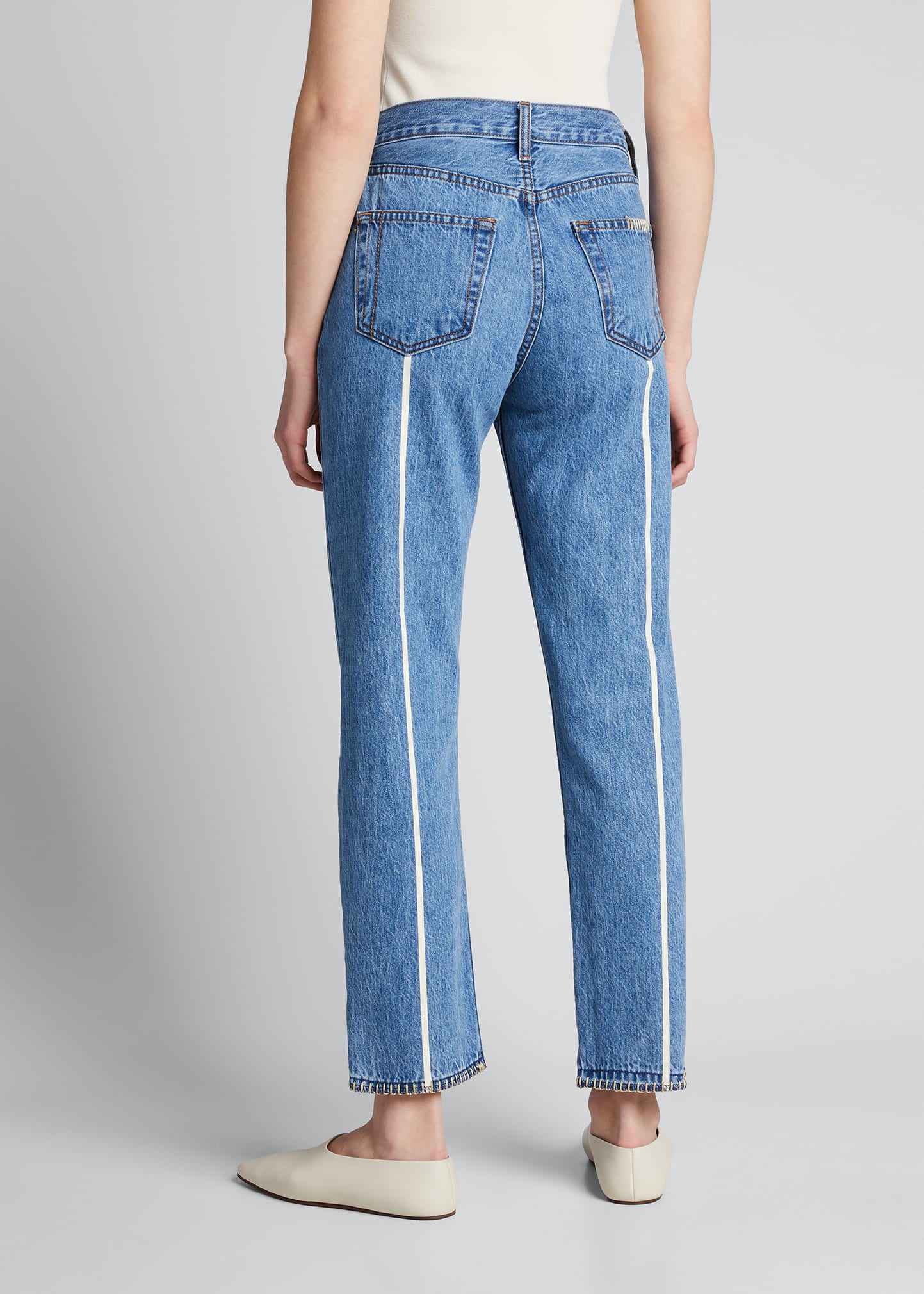 Still Here "Stone and Stitch Tate" jeans in rigid denim with painted back stripes. Approx. 26.8" inseam. High rise. Five-pocket style. Straight legs. Cropped at ankles. Button/zip fly; belt loops. Cotton. Made in USA.